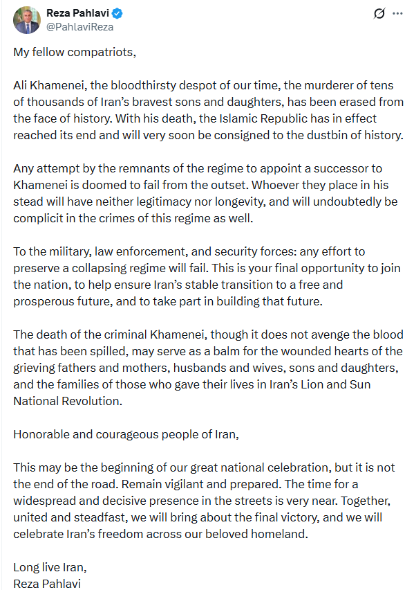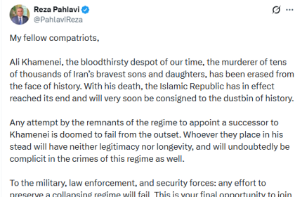 Sürgündeki Rıza Pehlevi: “Hamaney’in ölümüyle, İran rejimi fiilen sona erdi”