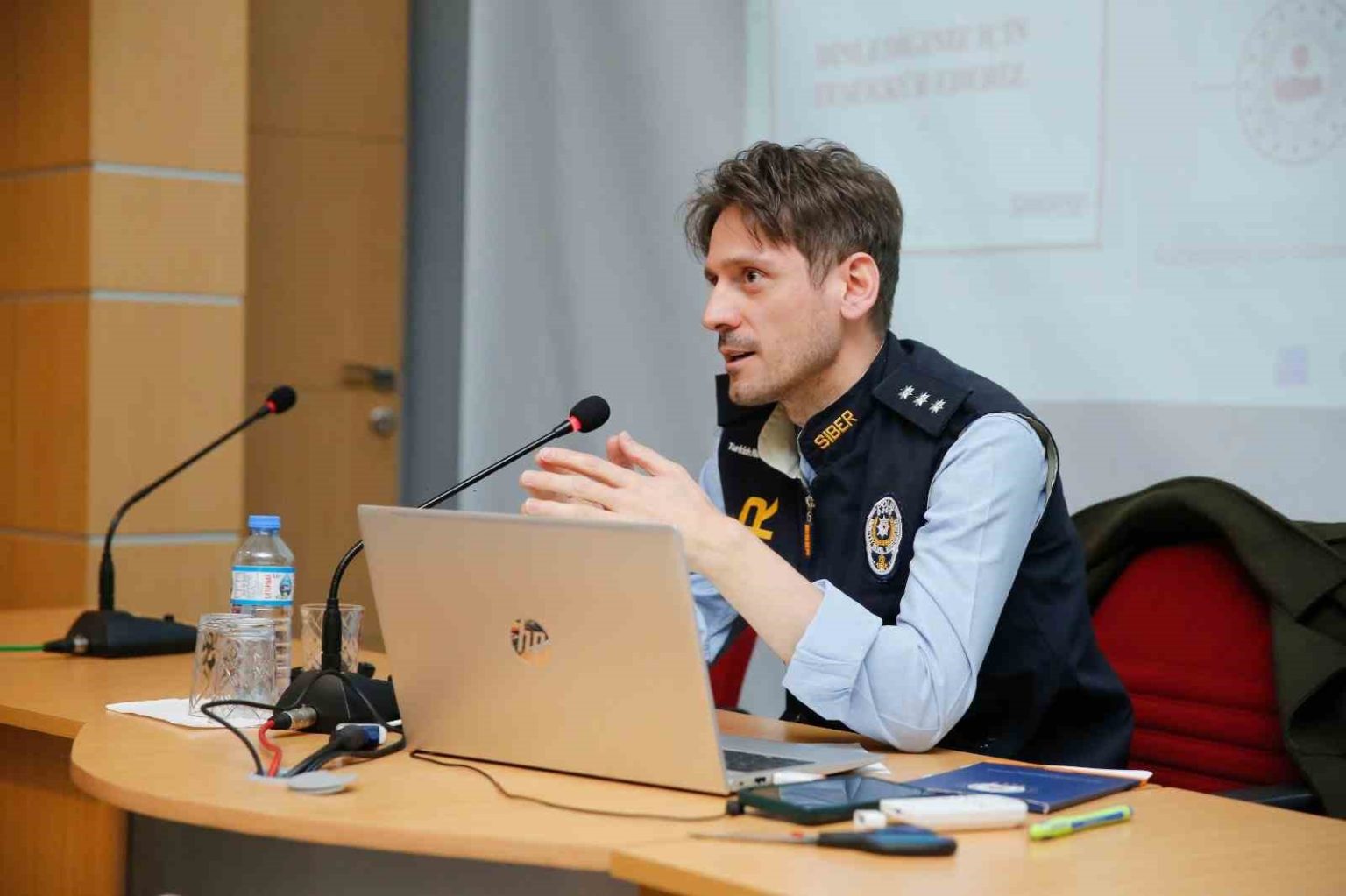Konferansa konuşmacı olarak katılan Siber Suçlarla Mücadele Şube Müdürlüğünde görevli Başkomiser Yusuf Yılmaz, yapay zeka teknolojilerinin kötü niyetli kişiler tarafından nasıl kullanılabildiğine dikkat çekti. Yılmaz, sahte ses ve görüntüler, oltalama (phishing) yöntemleri, deepfake içerikler ve dijital dolandırıcılık türleri hakkında öğrencileri bilgilendirdi.