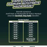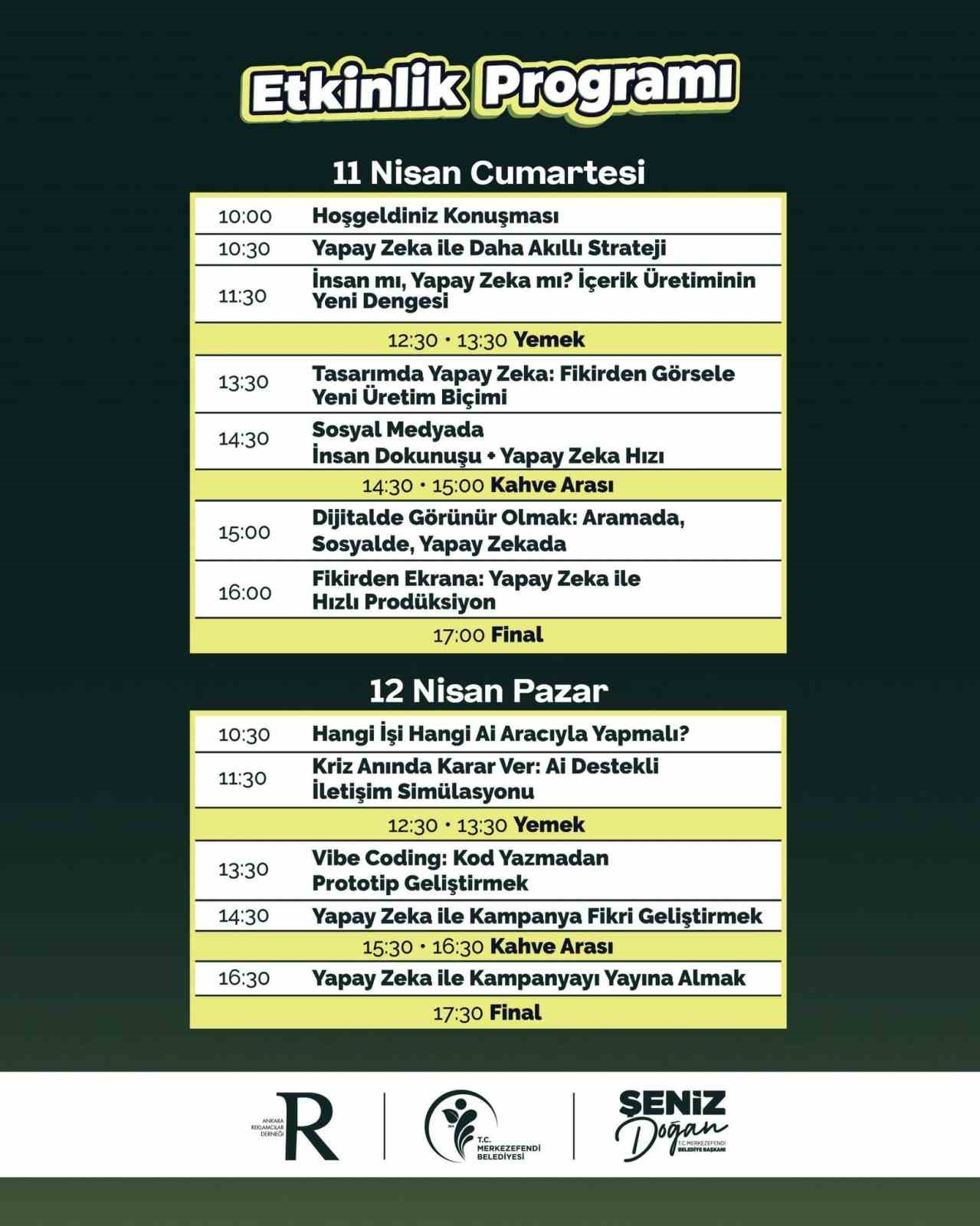 Alanında uzman kişilerden oluşan Onur Kulaklıoğlu, Yalçın Beydilli, Özgür Özdemircan, Amaç Ukav ve Uğur Özer konuşma yapacak. 11 Nisan Cumartesi günü program; 10.00’da açılış konuşmalarıyla başlayacak. 10.30’da Yapay Zeka ile Daha Akıllı Strateji eğitimi, 11.30’da İnsan mı, Yapay Zeka mı? İçerik Üretiminin Yeni Dengesi, 13.30’da Tasarımda Yapay Zeka: Fikirden Görsele Yeni Üretim Biçimi, 14.30’da Sosyal Medyada İnsan Dokunuşu – Yapay Zeka Hızı, 15.00’te Dijitalde Görünür Olmak: Aramada, Sosyalde, Yapay Zekada, 16.00’da Fikirden Ekrana: Yapay Zeka ile Hızlı Prodüksiyon eğitimi verilecek. 12 Nisan Pazar günü ise, 10.30’da Hangi İşi Hangi Ai Aracıyla Yapmalı?, 11.30’da Kriz Anında Karar Ver: Ai Destekli İletişim Simülasyonu, 13.30’da Vibe Coding: Kod Yazmadan Prototip Geliştirmek, 14.30’da Yapay Zeka ile Kampanya Fikri Geliştirmek ve son olarak 16.30’da Yapay Zeka ile Kampanyayı Yayına Almak eğitimi verilecek.