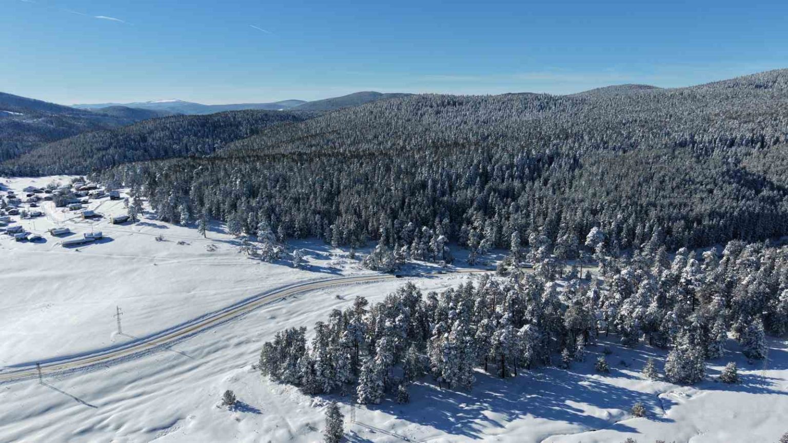 Bolu’nun güneydoğusunda Kartalkaya yolu üzerinde bulunan 14 köy yaylasından oluşan Sarıalan Yaylası, kış mevsiminin gelmesiyle birlikte beyaz örtüyle kaplandı. Yaylada oluşan kış manzarası havadan görüntülendi.