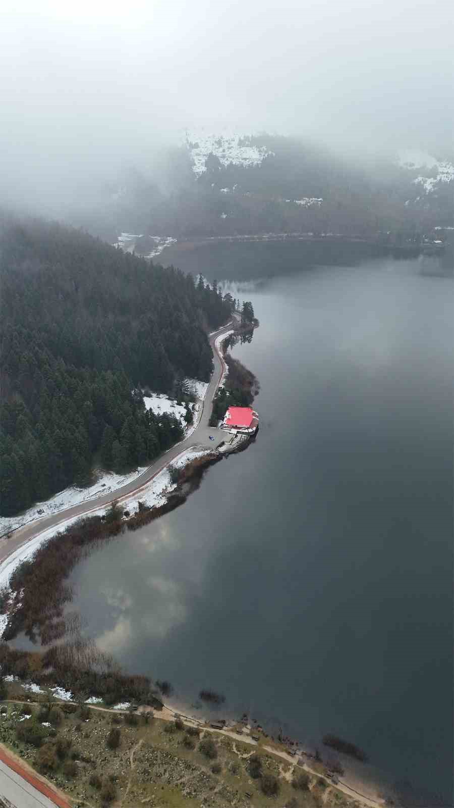 Bolu’nun doğa harikası Abant Gölü Milli Parkı, dağların eteklerini kaplayan kar ve göl üzerine çöken sisle birlikte kartpostallık manzaralar oluşturdu.