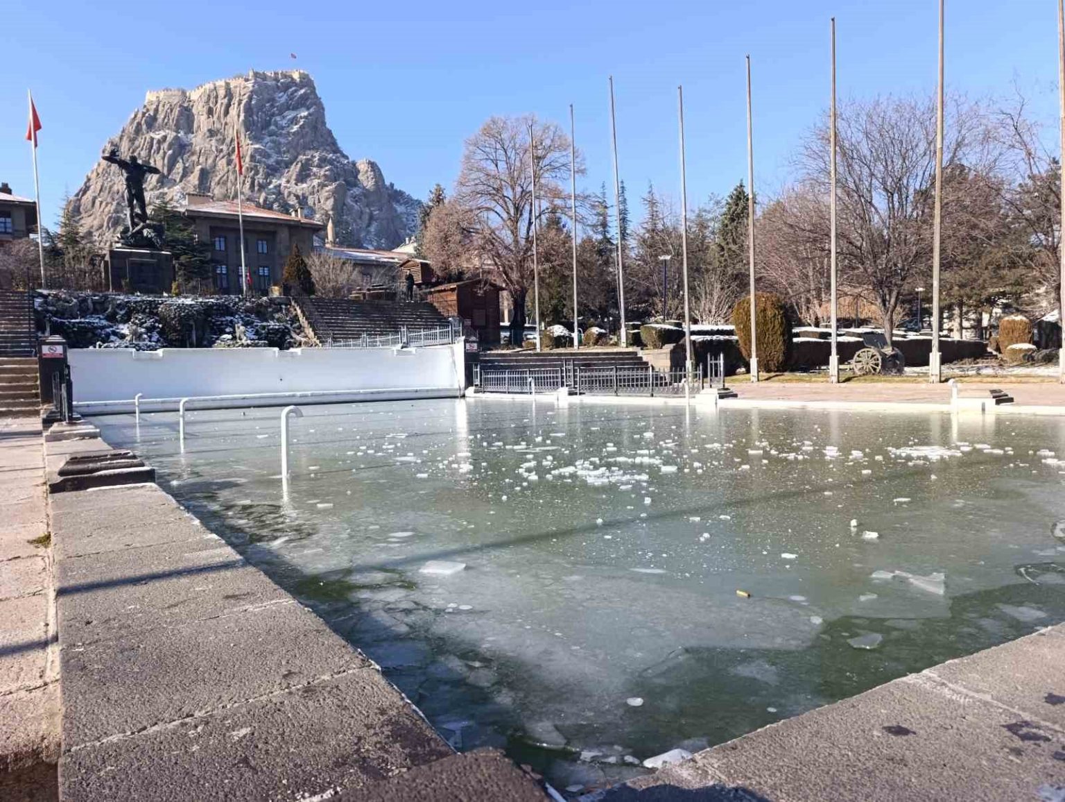 Olumsuz hava şartlarının devam ettiği Afyonkarahisar’da hava sıcaklıkları yaklaşık bir haftadan bu yana eksik derecelerde seyretmeye devam ediyor. Sıcaklıkların sıfırın altında eksi 13 derecelere kadar düştüğü kentte şelaleler, çaylar, dereler ve süs havuzları dondu. Soğuk havalardan dolayı kent sokakları ve caddeleri boş kalırken vatandaşların zaruri olmadıkça dışarıya çıkmadıkları gözlendi.