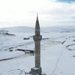 Ağrı’nın merkeze bağlı Başçavuş köyünde, baraj sularının çekilmesiyle yeniden görünür hale gelen tarihi minare, kış mevsiminde karlar altındaki görüntüsüyle ilgi odağı oldu.