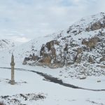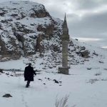 Ağrı’da barajdan çıkan tarihi minare kış manzarasıyla büyüledi