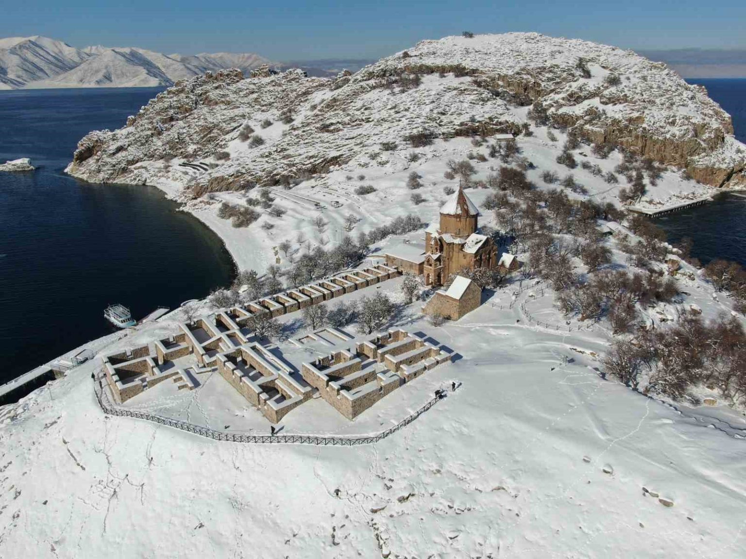 Van Gölü’nün incisi Akdamar Adası, etkili olan kar yağışıyla birlikte adeta beyaz gelinliğini giydi. Tarihi Akdamar Kilisesi ve ada çevresini saran kar örtüsü kartpostallık görüntüler oluştururken, manzarayı görmek isteyen doğaseverler soluğu adada aldı.