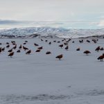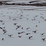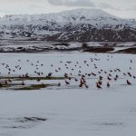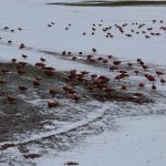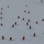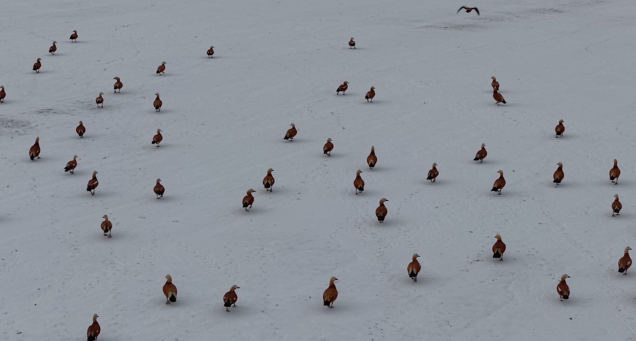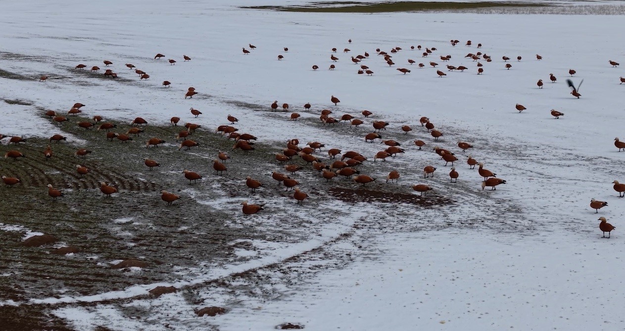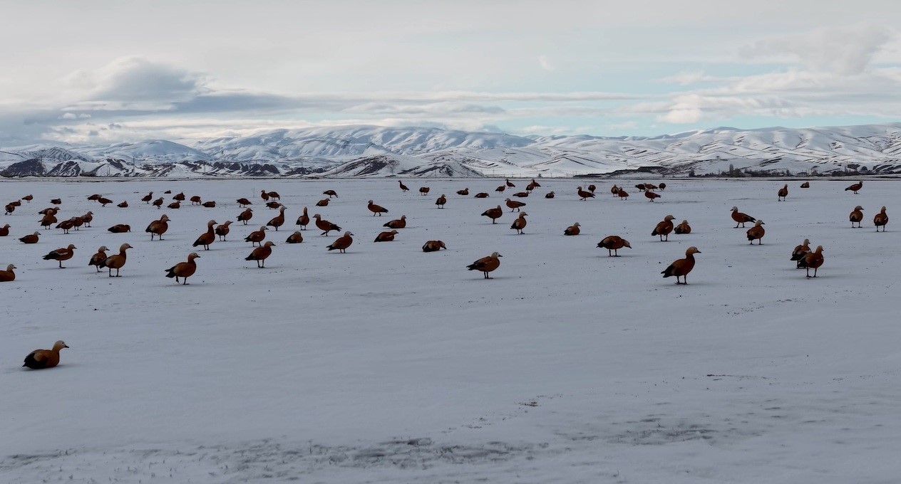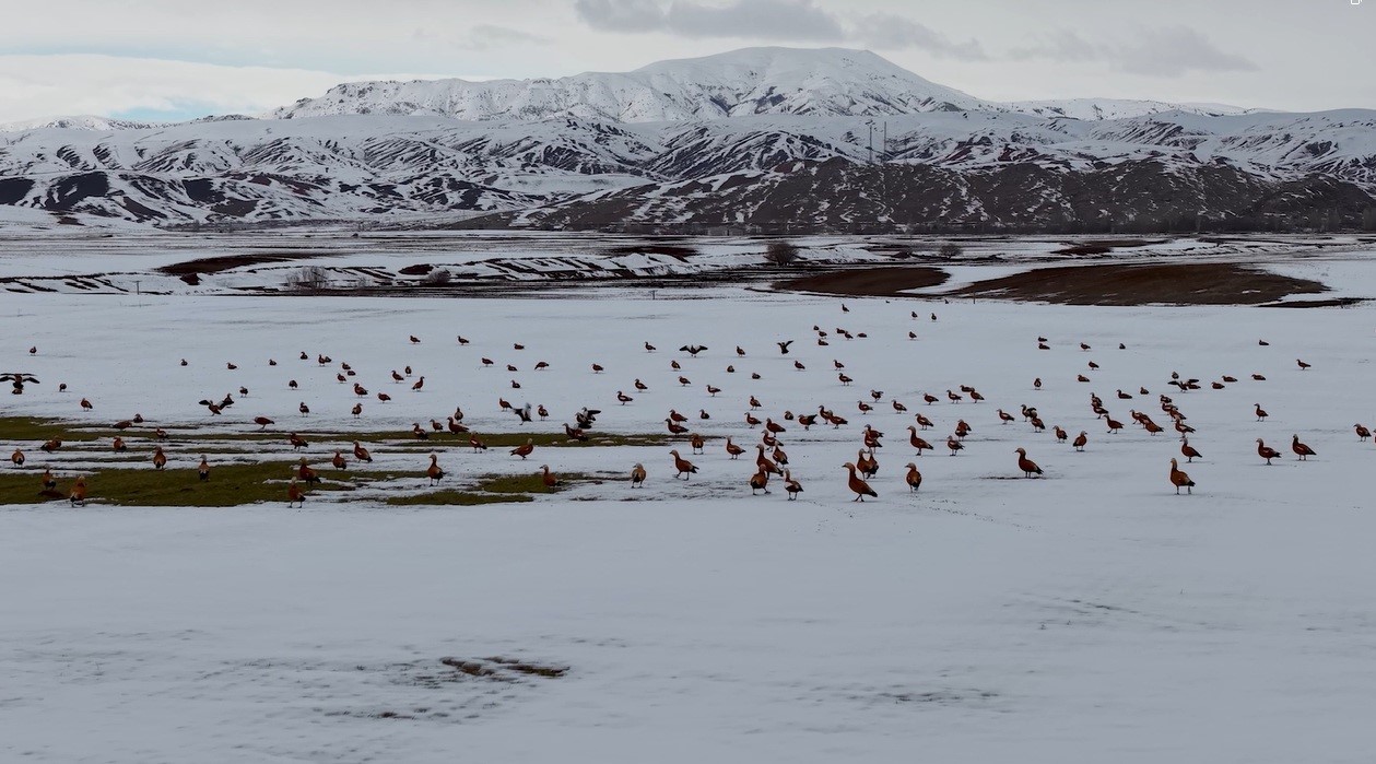 Görüntü yönetmeni Mustafa Başgöze tarafından drone ile kaydedilen görüntülerde, ördek türü olan angut kuşlarının Erzincan Ovası’nda karlı arazide sürü halinde dolaştığı görüldü.