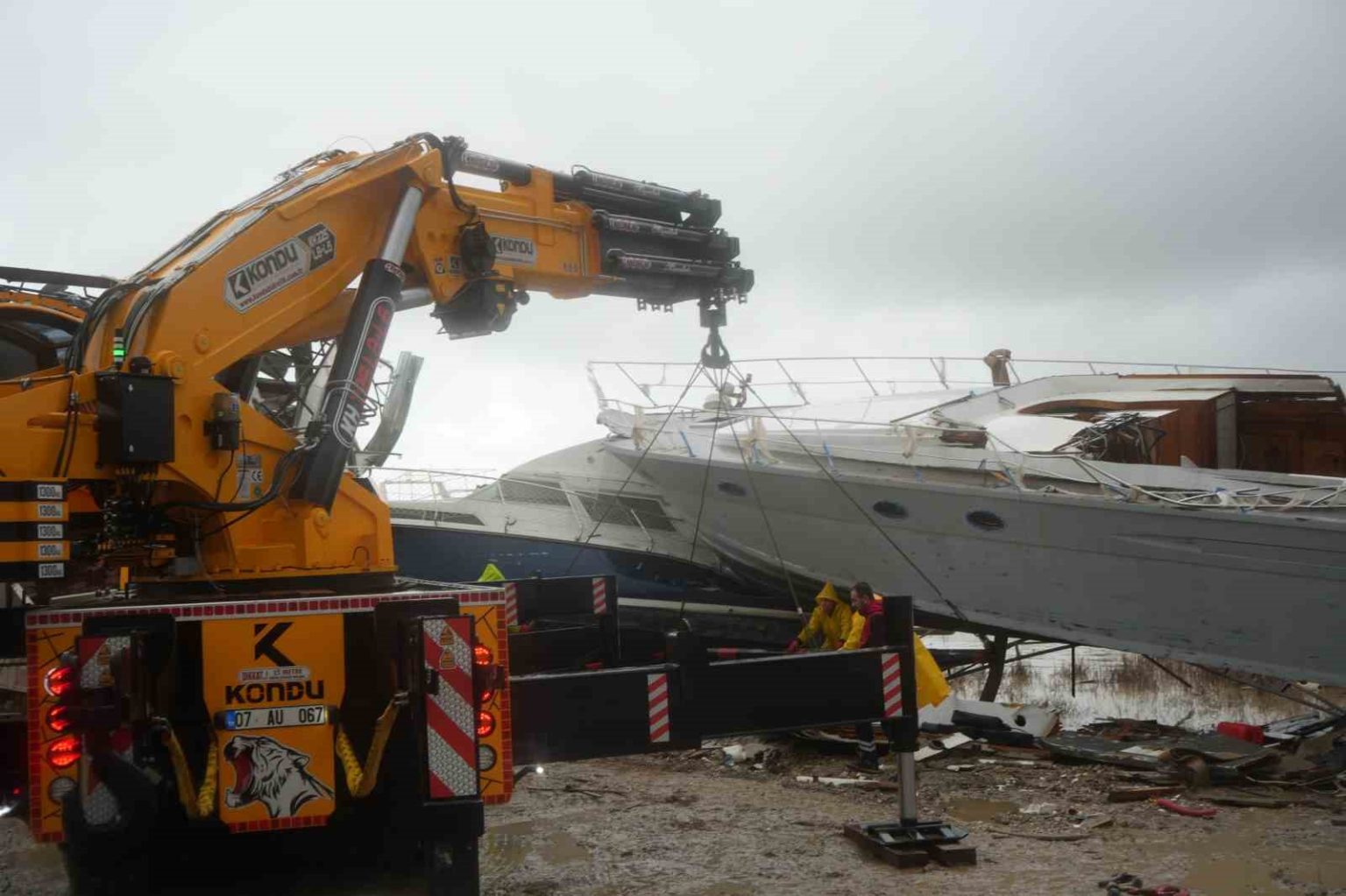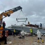 Antalya’nın Aksu ilçesinde metrekareye 190 kilogramı aşan yağışın ardından Aksu Çayı çevresinde oluşan hortumun milyonlarca lira değerindeki tur ve balıkçı teknelerinde yol açtığı büyük yıkımın ardından, onarımı mümkün olan tekneler vinç ve kepçe yardımıyla düzenlenen alana taşınarak yeniden turizm sezonuna hazırlanıyor.