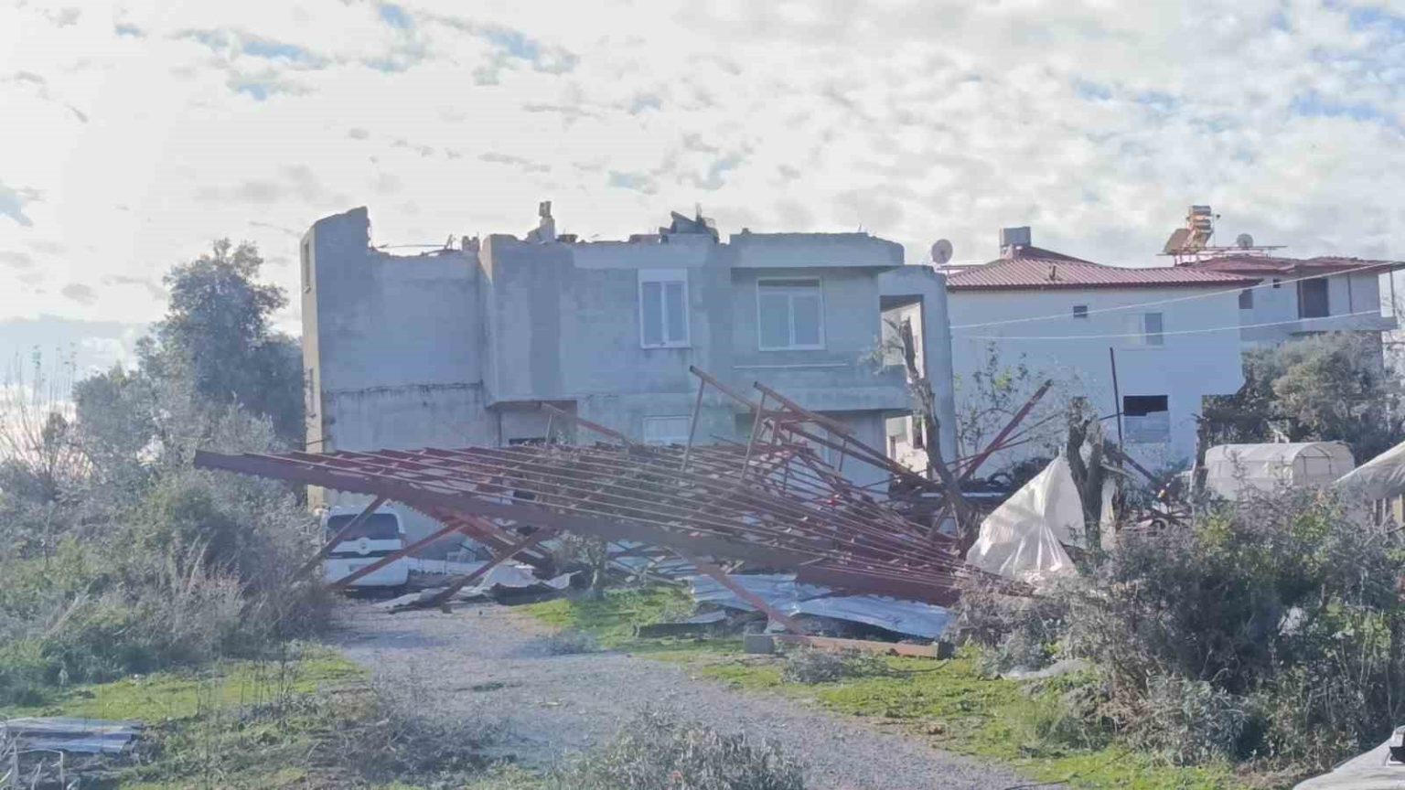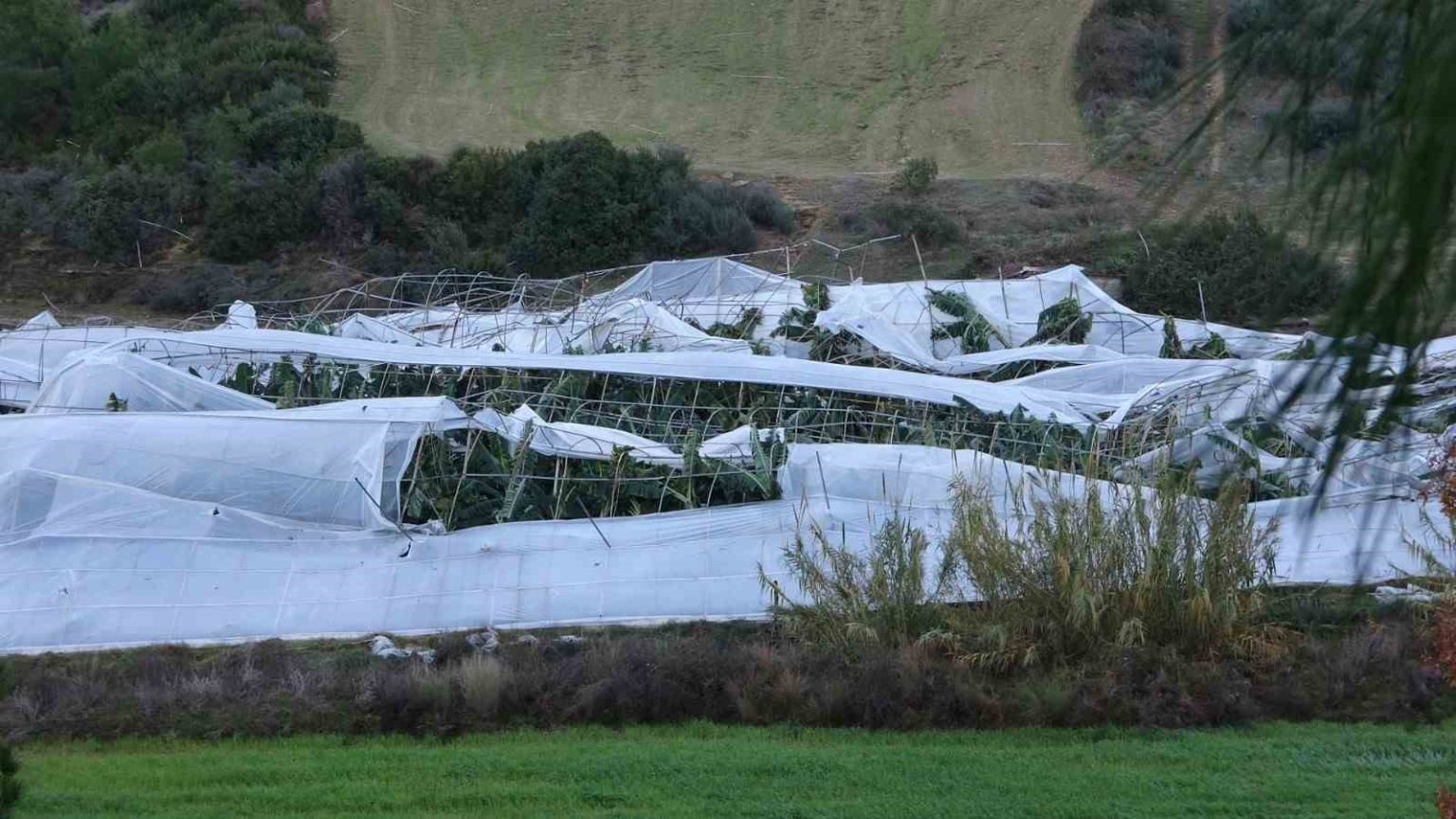Karacalar Mahallesinde büyük bölümü muz serası olmak üzere çok sayıda serayı yerle bir eden hortum, önüne kattığı ağaçları yüzlerce metre ileriye bırakırken, Sülek Mahallesine gelen çatı parçalarının Karacalar tarafından geldiği bildirildi.