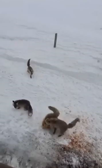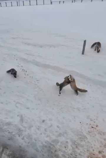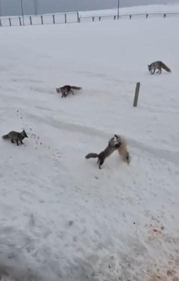Karayolları personeli tarafından beslenen tilkiler, kendi aralarında ekmek kavgasına düştüler. Uzun bir süre kavga eden tilkiler daha sonra verilen yiyecekleri yemeye başladı. Bu güzel anlar ise cep telefonu ile kayda alındı.