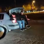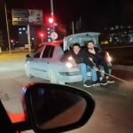 Elazığ’da bir aracın bagaj kısmını oturan 2 kişi, arızalanan TOFAŞ Doğanı iple çekti.