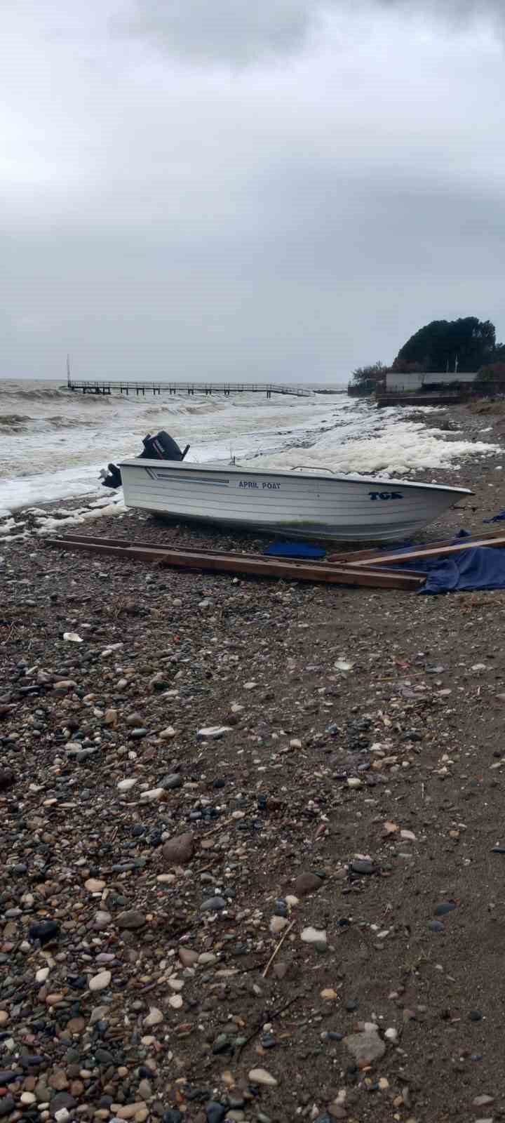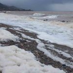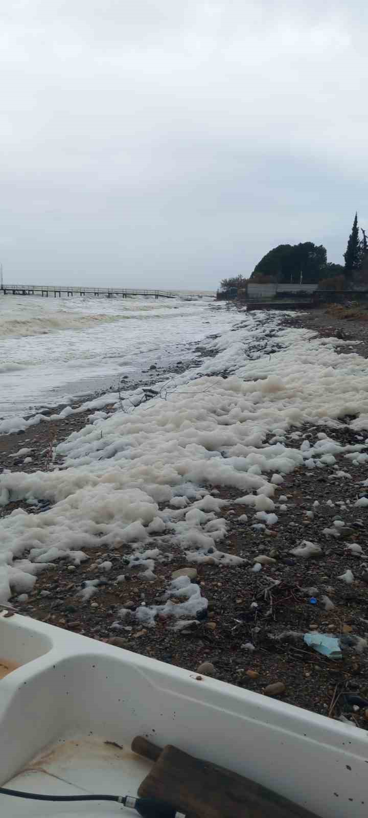Çanakkale’nin Ayvacık ilçesinde şiddetli dalgaların da etkisiyle kıyıya vuran deniz suyu sahilde köpük oluşturdu.