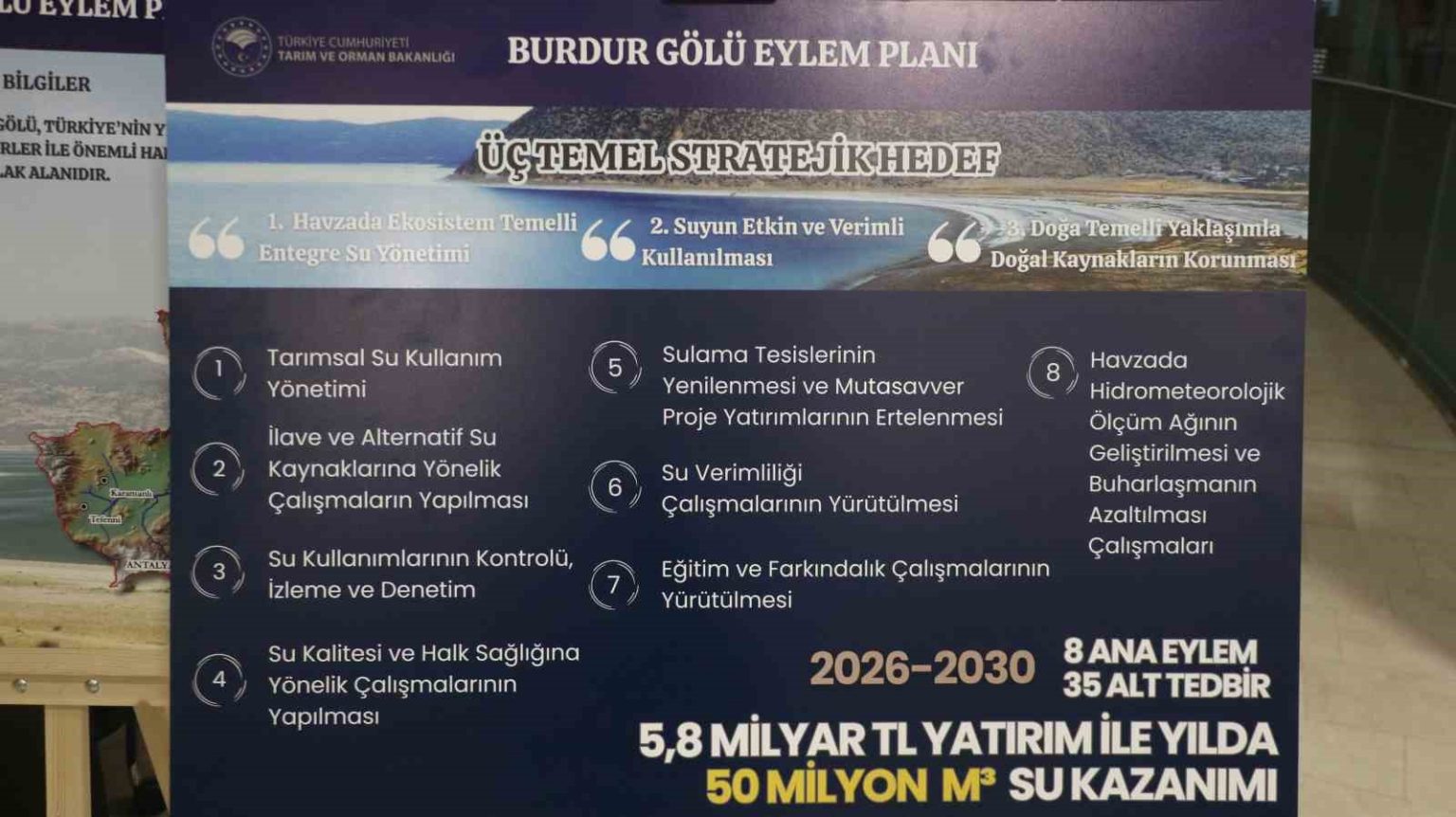 Türkiye’deki birçok gölün kurumaya yüz tuttuğunu ve kuraklığın önümüzdeki yıllarda daha da belirginleşeceğinin altını çizen Bakan Yumaklı, “İklim değişikliğinin ülkemiz açısından en görünümlü taraflarından birisi de göllerin kurumasıydı. Özellikle göllerimizin büyük bölümünde buharlaşmanın etkisiyle su kaybı mevcut. Eğirdir Gölündeki buharlaşma kaybı yüzde 79, Burdur Gölündeki buharlaşma kaybı yüzde 78’dir. Bu çerçevede göllerimiz için hazırlamış olduğumuz eylem planlarının hızlıca hayata geçirilmesini arz ediyoruz. Sırada diğer göllerimiz var. Bu çerçevede her bir gölün ekolojik özellikleri, kullanım amaçları ve gelinen listeler doğrultusunda tehdit ediliyor” ifadelerine yer verdi.