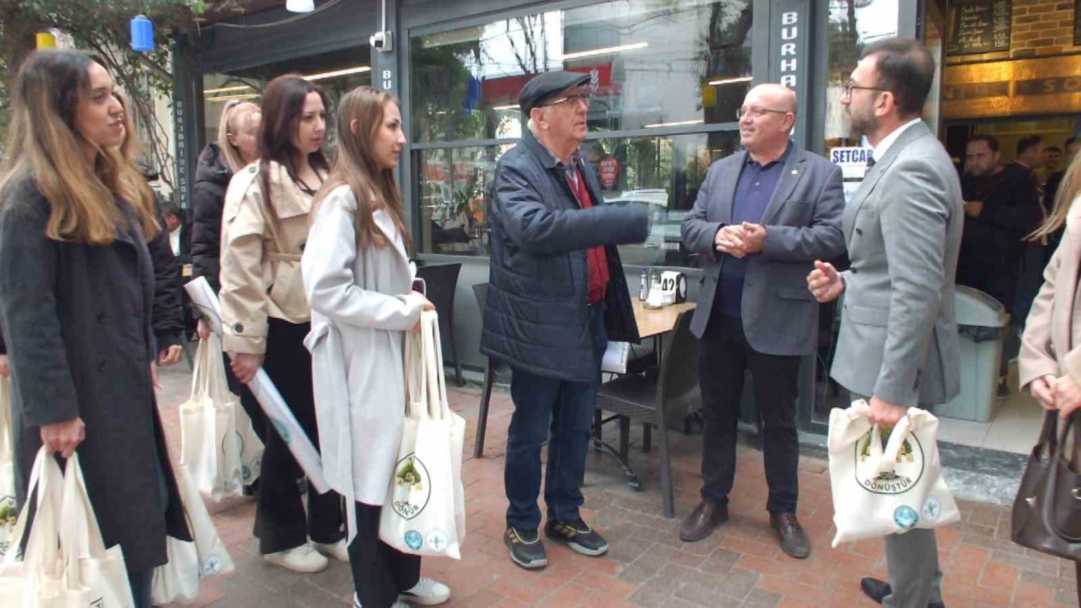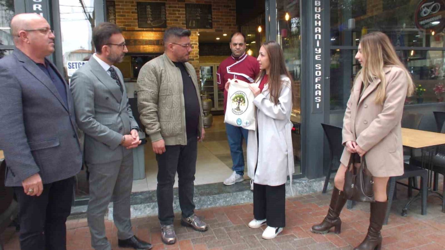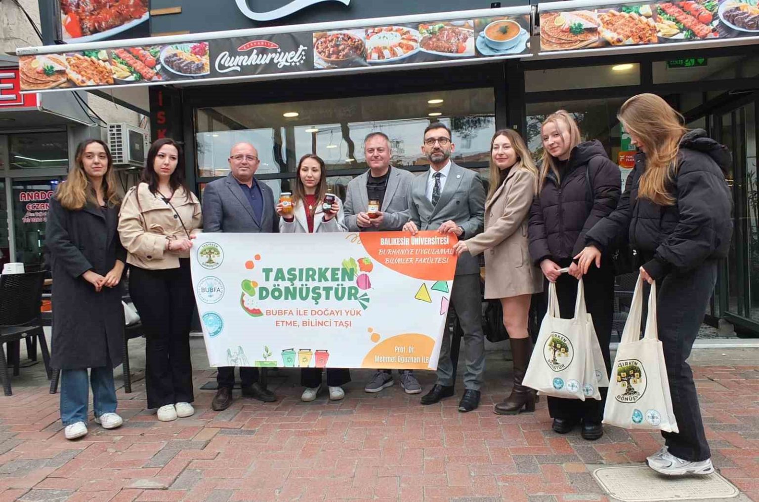 İlçenin Hürriyet Caddesinde bir araya gelen öğrenciler caddedeki esnafları ziyaret ederken, etkinliğe Uygulamayı Bilimler Fakültesi Dekanı Prof. Dr. Mehmet Oğuzhan İlban ile Burhaniye Ticaret Odası Başkanı Hasan Varol da katıldı. Caddedeki esnafları ziyaret eden 5 öğrenci, üzerinde Taşırken Dönüştür yazan torbalar içinde turşu ve reçel dağıttı, sıfır atık konusunda bilgilendirme yaptı. Öğrenciler Hürriyet Caddesindeki 30 esnafı ziyaret etti. Projede görev alan öğrenciler mutluluklarını dile getirdi. Esnafları Bilinçlendirmek istediklerini kaydeden Ziynet Yayla “Biz Burhaniye Uygulamalı Bilimler Gastronomi 3.Sınıf öğrencisiyiz. Fakültemizde sosyal sorumluluk projesi kapsamında sıfır atık adına bir proje yürütüyoruz. Projemizin adı Taşırken Dönüştür. Projeni amacı sıfır atık bilincini yaygınlaştırmak. Bu konuda insanları bilgilendirmek. Bu projelerde insanları bilinçlendirmeyi amaçladık” dedi. Begüm Taslacı da, “Bu günkü projemizin adı Taşırken Dönüştür. Bu projede 5 kişi görev alıyoruz. Meyveleri sebzeleri atmak yerine bunların hepsini kullanarak turşu ve reçeller yapıyoruz. Fazlalarını atmıyoruz. Bu projemizin amacı atığı minimum seviyeye indirmek” dedi. Zeki Özkan ise, “Bu gün projemiz gereği halkımızı ve esnaflarımızı bilinçlendirmek için çanta dağıtımına çıktık. Atıklardan ürünler ürettik, tüketilebilir şekilde. Bu ürünlerle esnafı bilinçlendirmek en büyük hedefimiz bu proje de olduğum için mutluluk duyuyorum” diye konuştu.