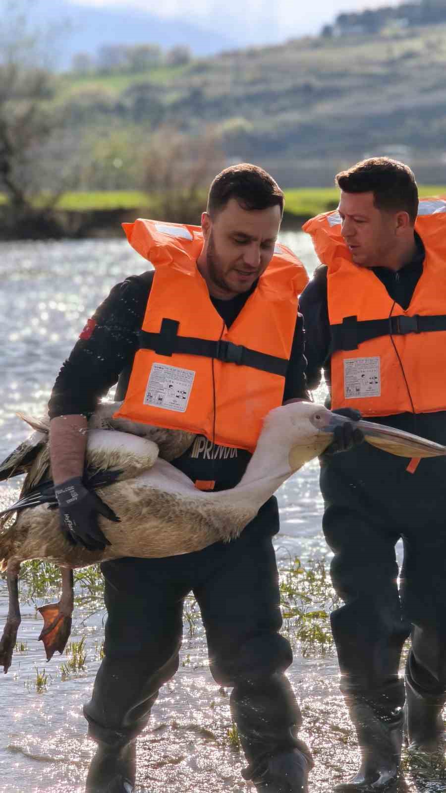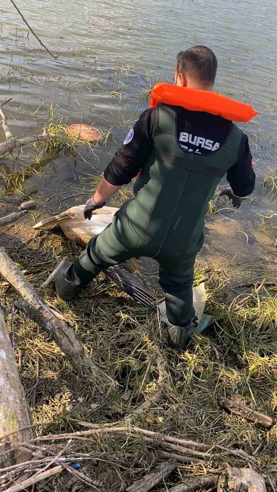 Olay, İnegöl Boğazköy Barajı çevresinde meydana geldi. Baraj kenarından geçen vatandaşlar, su içerisindeki çalılık alanda hareketsiz halde bulunan pelikanı fark etti. Durumun bildirilmesi üzerine olay yerine İnegöl İtfaiye Arama Kurtarma ekipleri sevk edildi. Kısa sürede bölgeye ulaşan ekipler, suya uygun özel kıyafetlerini ve can yeleklerini giyerek kurtarma çalışması başlattı. Zorlu şartlarda gerçekleştirilen çalışmada, çalılıklar arasında sıkıştığı belirlenen yaralı pelikan bulunduğu yerden dikkatli bir şekilde çıkarıldı. Kurtarılan pelikan, tedavi altına alınmak üzere İnegöl Belediyesi Sahipsiz Hayvan Bakım ve Tedavi Merkezi’ne götürüldü. Pelikanın sağlık durumunun yapılacak kontrollerin ardından netlik kazanacağı öğrenildi.