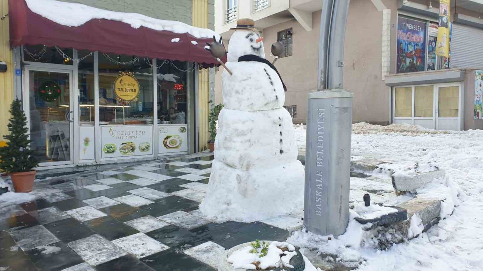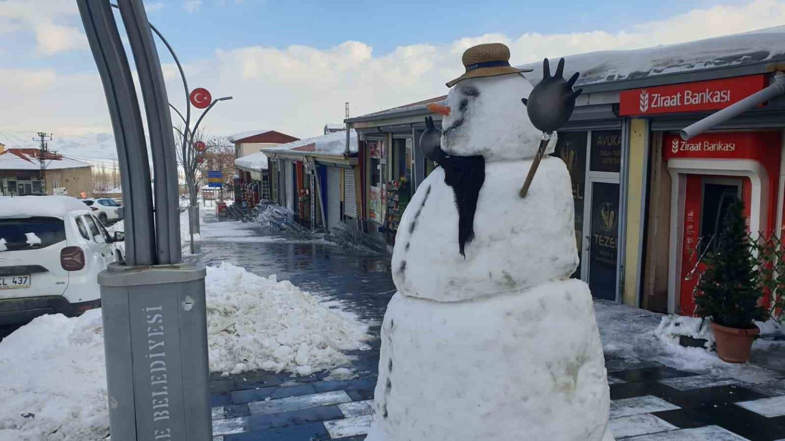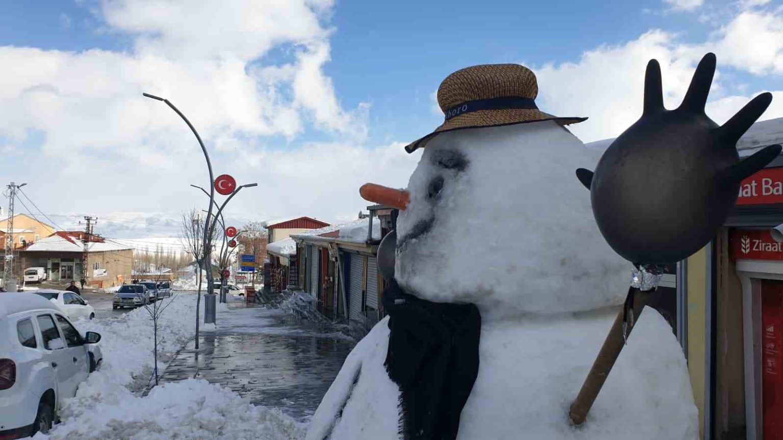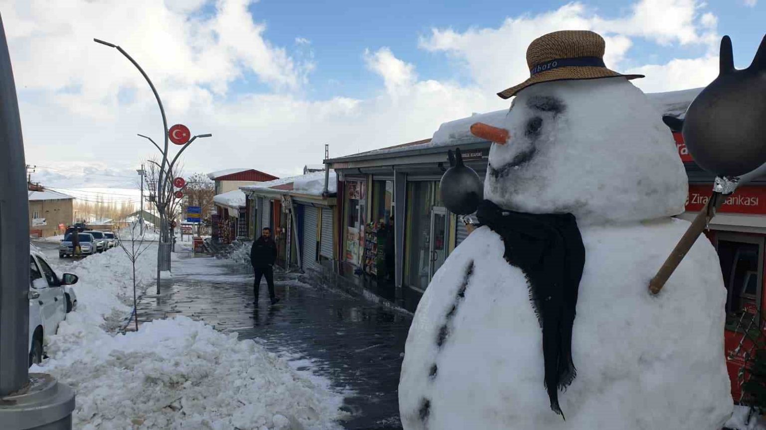 Van’ın Başkale ilçesinde kar yağışının etkisini kaybetmesinin ardından temizlik çalışması başlatılırken, fazla müşteri bulamayan esnaf ise kardan adam yaparak zaman geçirdi.