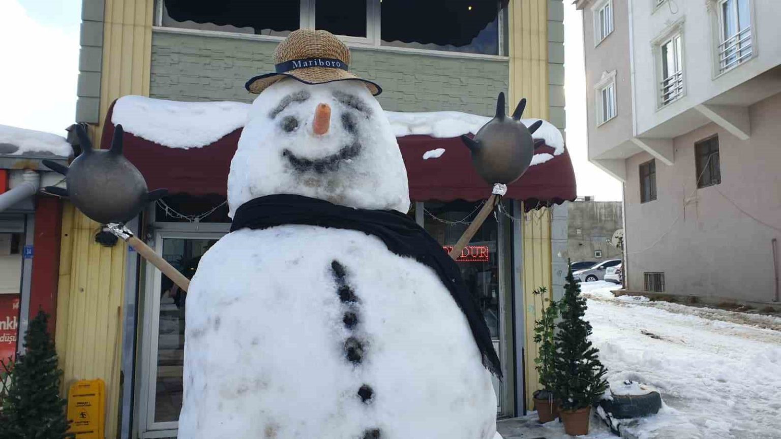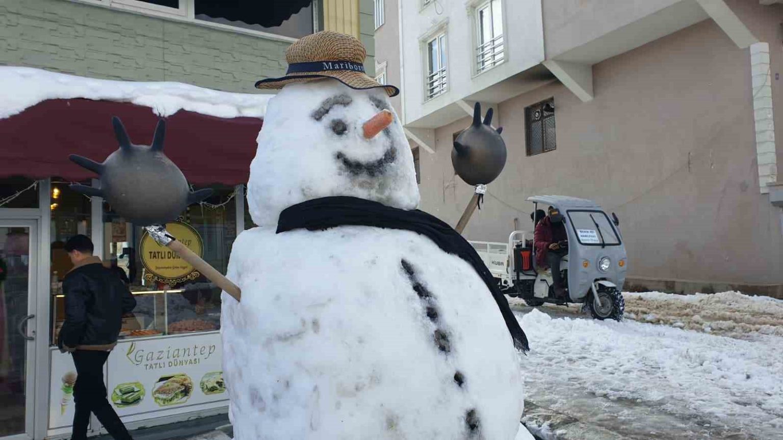 Pazar günü işletmelerini açan esnaf da karı eğlenceye dönüştürdü. Cadde ve sokaklarda biriken kar yığınlarından kardan adam yapan esnaf, vatandaşların ilgi odağı oldu. Kardan adamla fotoğraf çektiren vatandaşlar ise bu anı ölümsüzleştirdi.
