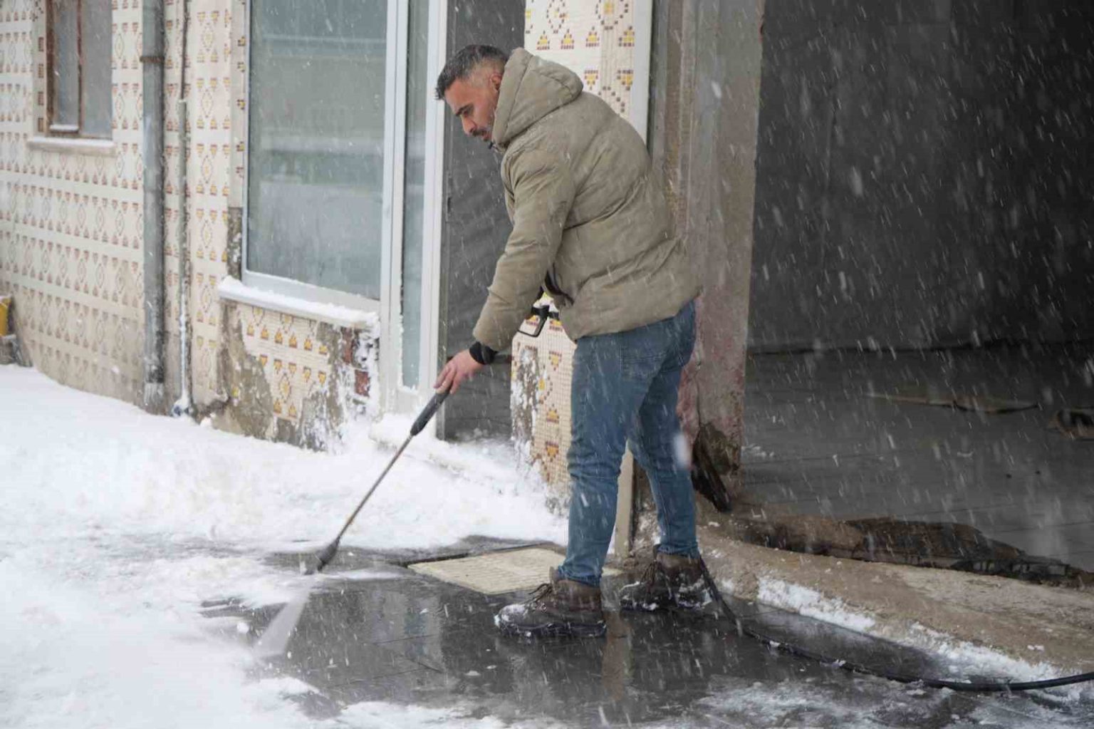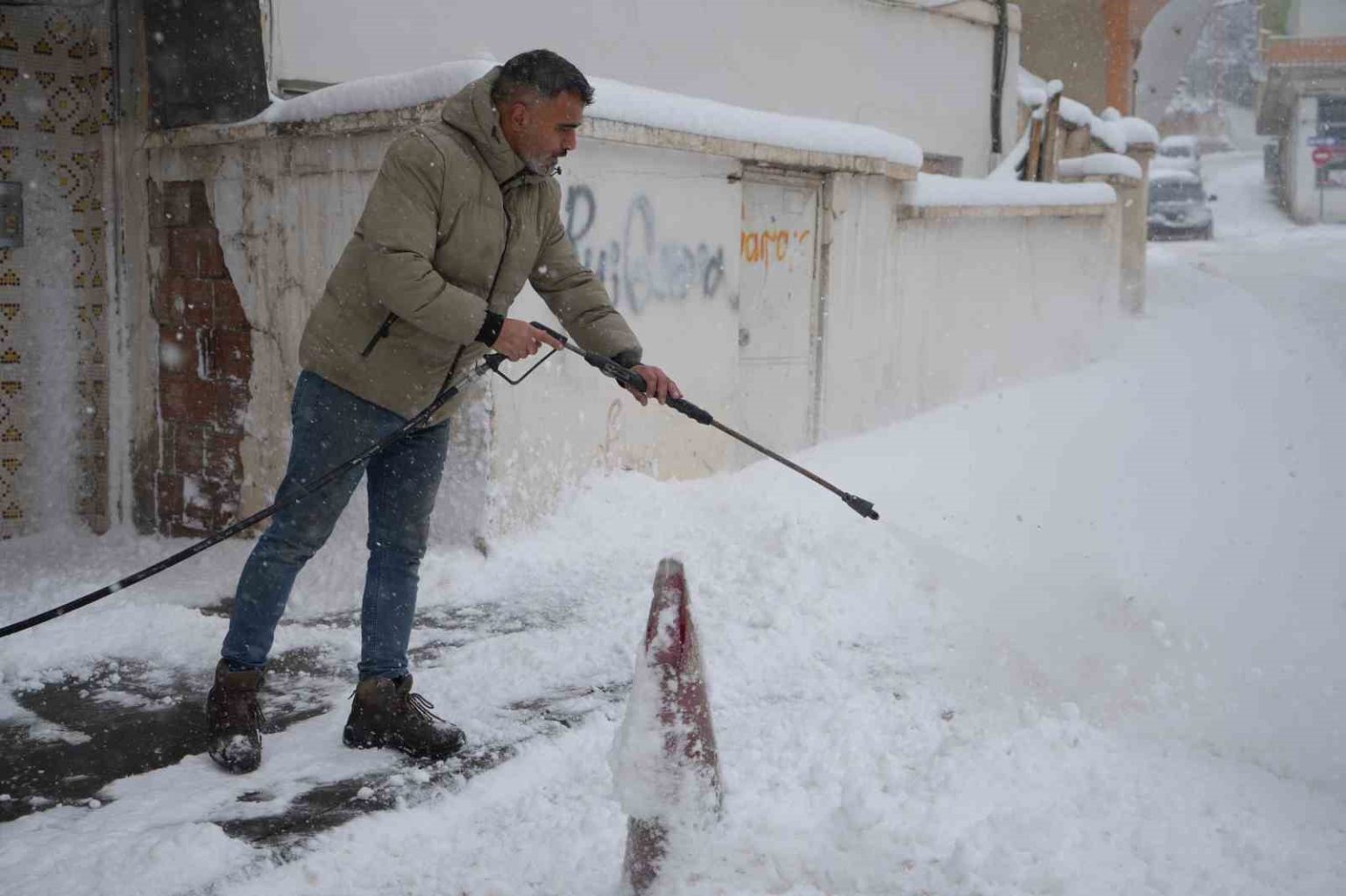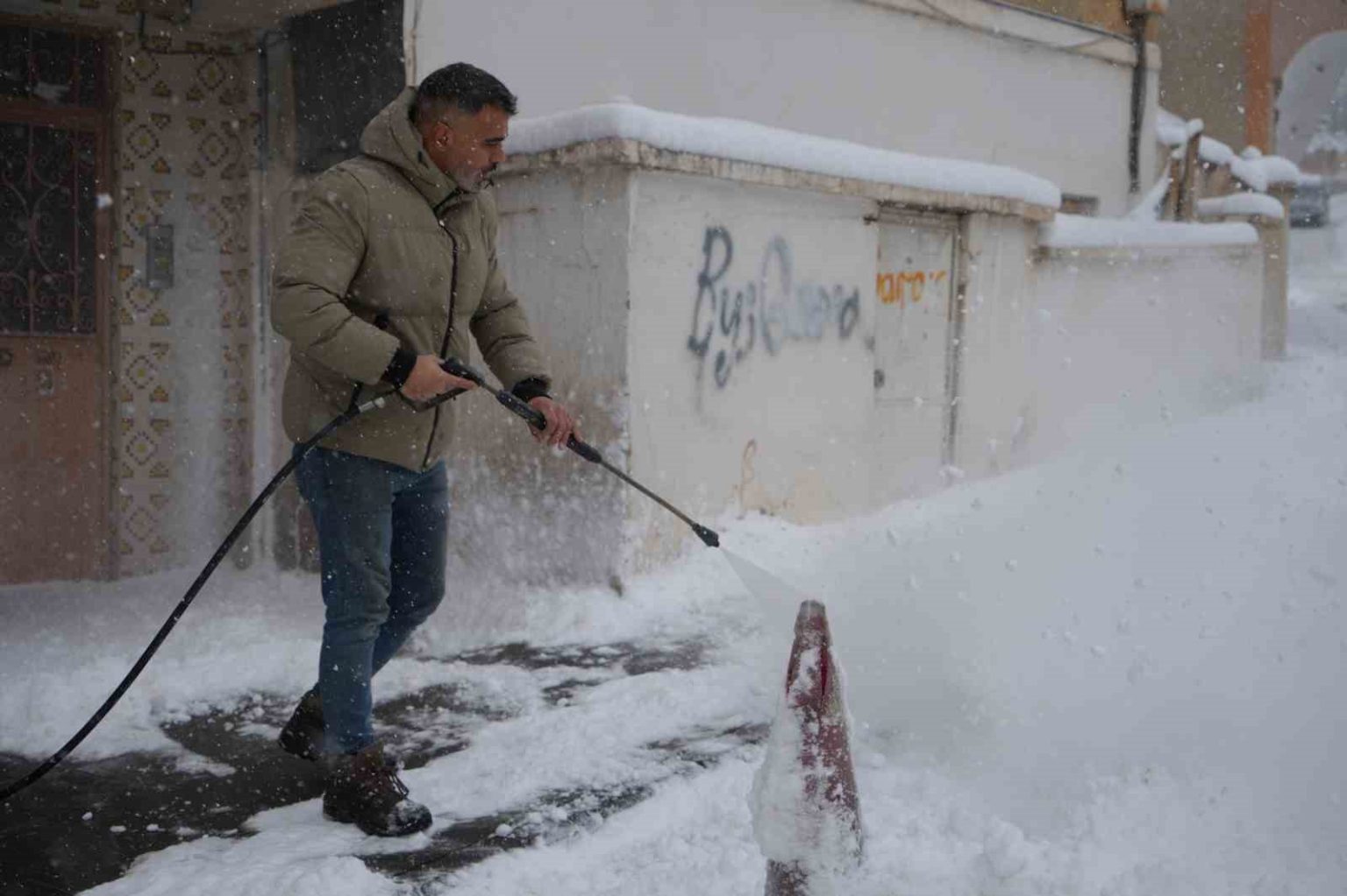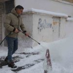 Sürekli kar küremekten yorulan oto yıkama işletmecisi Karahan, iş yerinin önündeki kar birikintilerini kürek ve süpürge yerine, oto yıkamada kullanılan yüksek basınçlı su makinesiyle temizledi. Karı basınçlı suyla kısa sürede temizleyen Karahan, temizlik sonrası oluşabilecek buzlanmaya karşı da tuz dökerek önlem aldı.