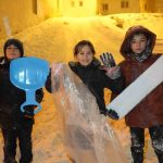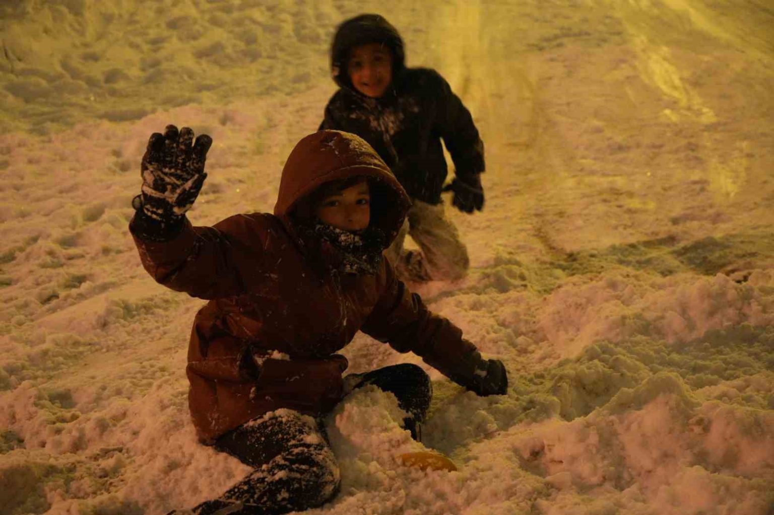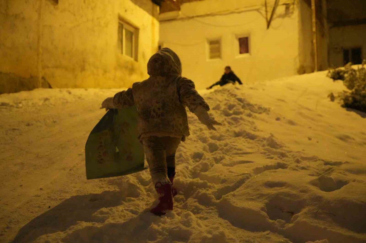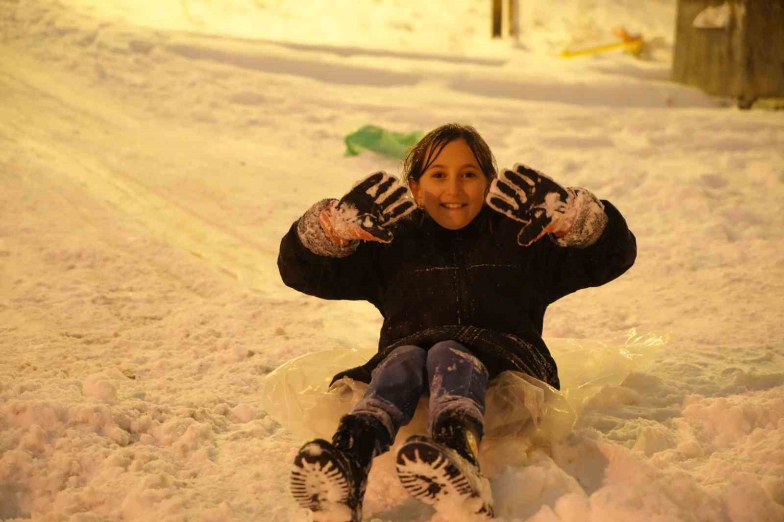 Okulların tatil edildiğini duyan Şingah Mahallesi’nin çocukları, karla kaplanan dik yokuşlarda tepsi ve poşetlerle kayarak gönüllerince eğlendi. Soğuk havaya aldırış etmeyen çocukların neşeli anları renkli görüntüler oluşturdu.