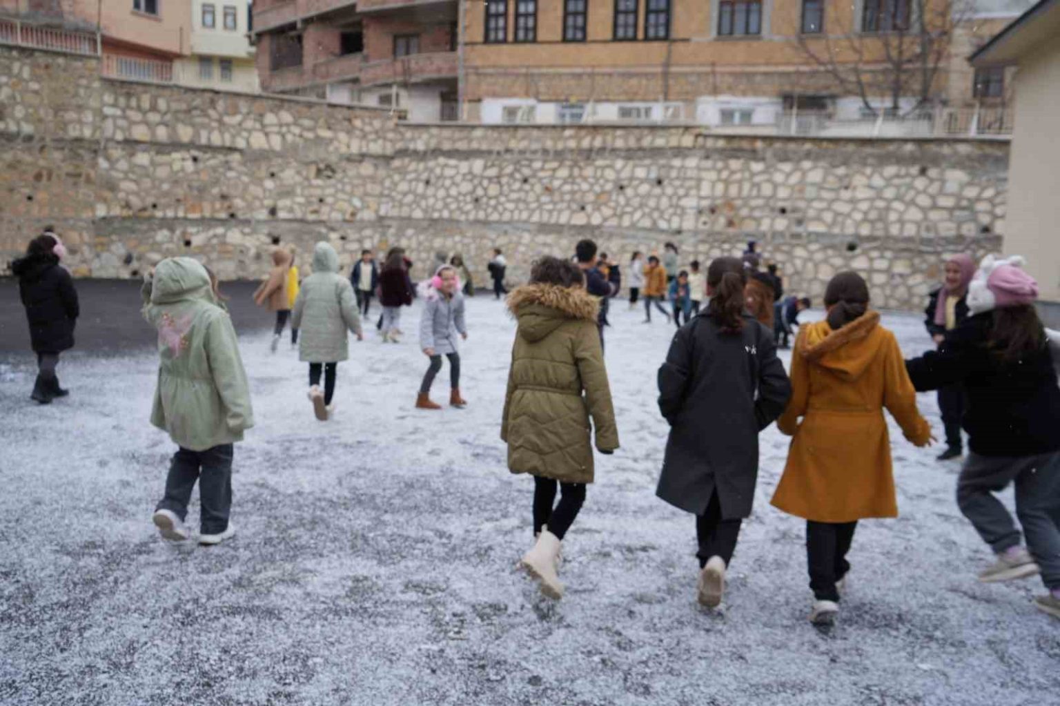Karın yağdığını gören öğrenciler, teneffüs zilinin çalmasıyla birlikte soluğu okul bahçesinde aldı. Karın tadını doyasıya çıkaran Ali Eymen Antika, Emir Subay ve Fatma Zehra Demiray isimli öğrenciler, arkadaşlarıyla koşuşturup, birbirleriyle oyunlar oynayarak karın keyfini çıkardı.