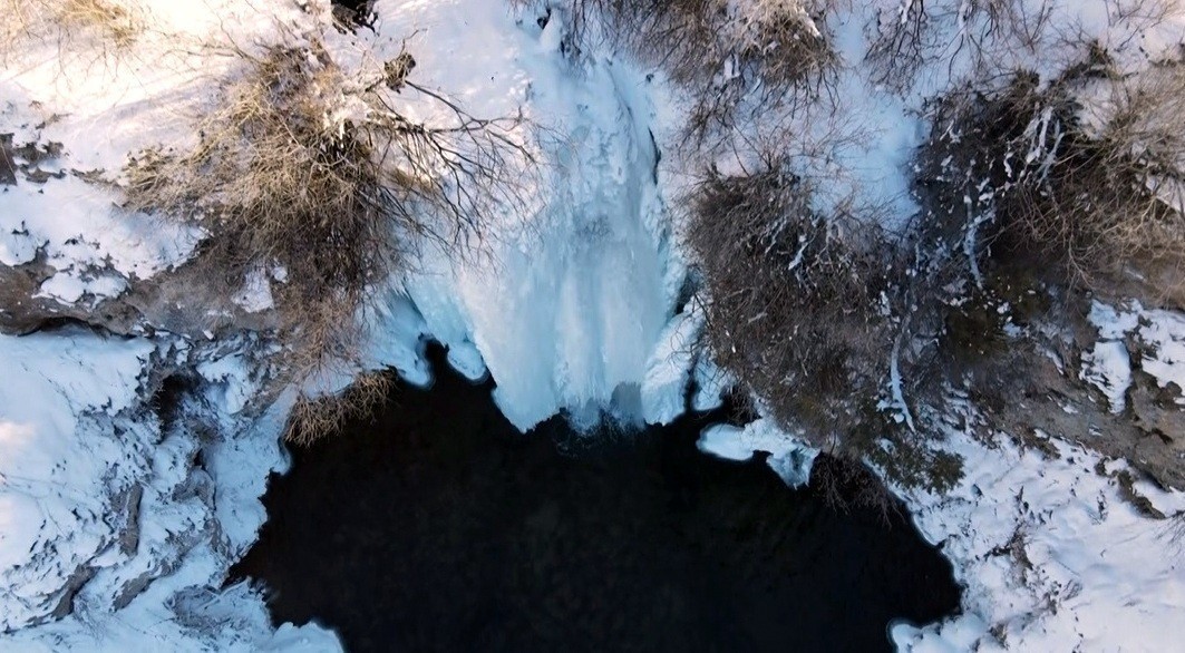 Hava sıcaklığının eksi 20 dereceye düştüğü Bayburt’ta buz tutan Sırakayalar Şelalesi, manzarasıyla adeta kartpostallık görüntü oluşturdu.
