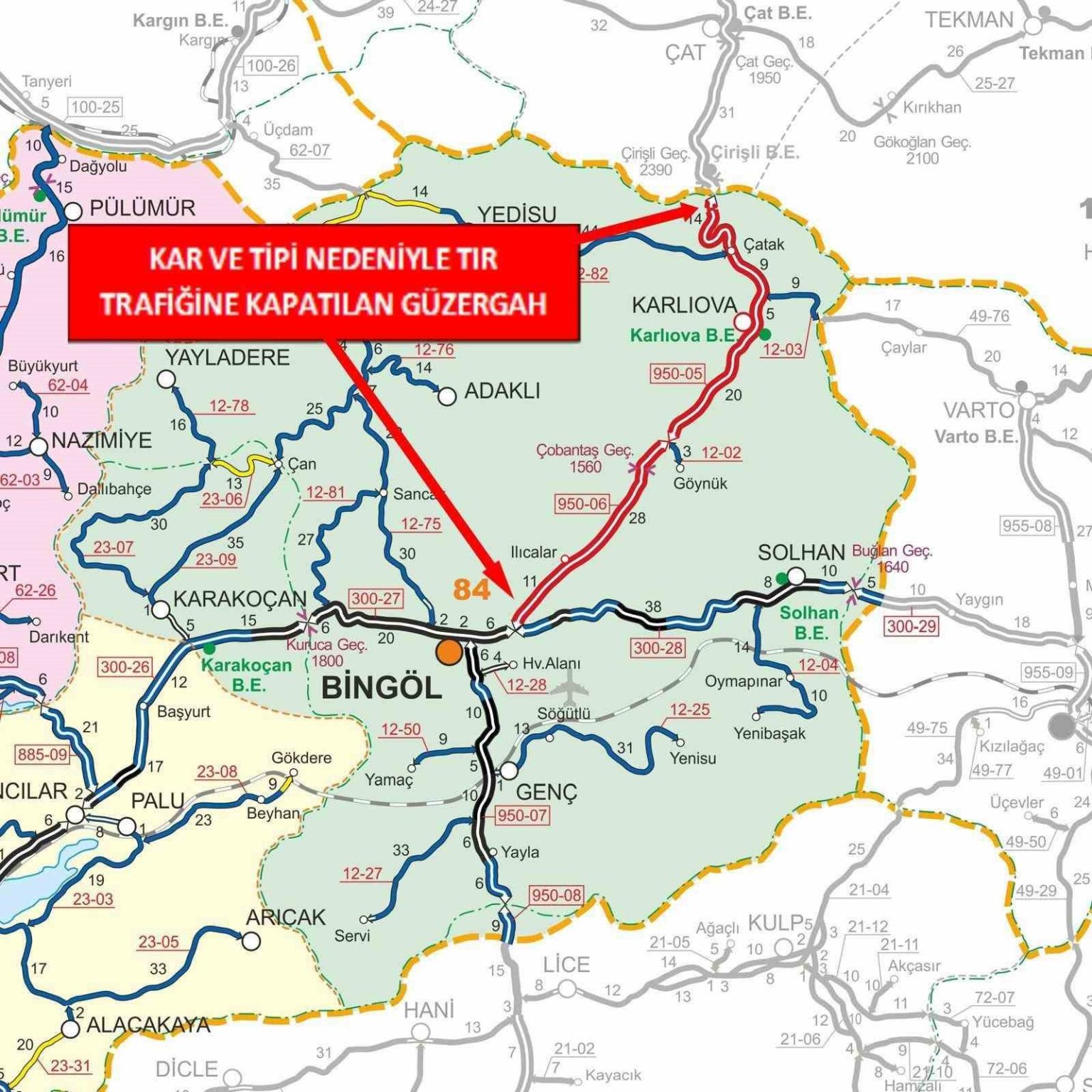 Bingöl Valiliği’nden yapılan açıklamada, “Bingöl-Erzurum Devlet Yolunun 0-88 km’leri arası (Kervansaray kavşağı ile Bingöl-Erzurum il sınırı arası) ve Bingöl-Diyarbakır devlet yolunun 0-31 km’leri arası (Genç ilçe girişi ile Diyarbakır il sınırı arası) yoğun kar yağışı ve tipi nedeniyle saat 20.30 itibarıyla TIR trafiğine kapatılmıştır” denildi.