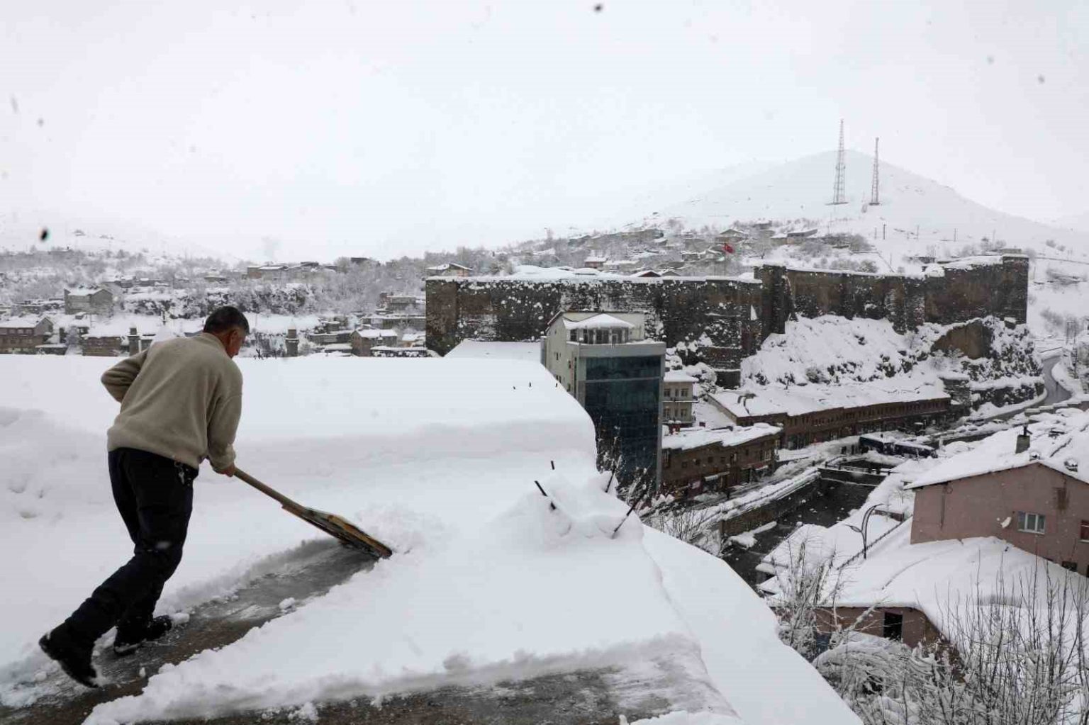 Bitlis’te etkili olan yoğun kar yağışı sonrası kent genelinde vatandaşlar çatılarda kar küreme mesaisine başladı.