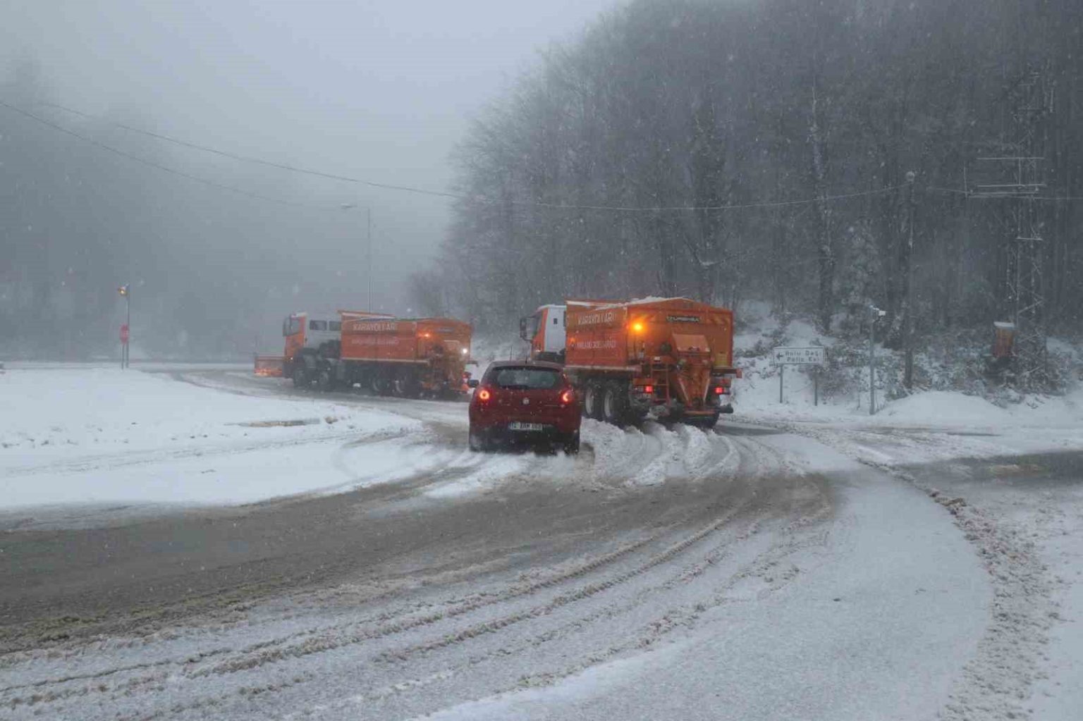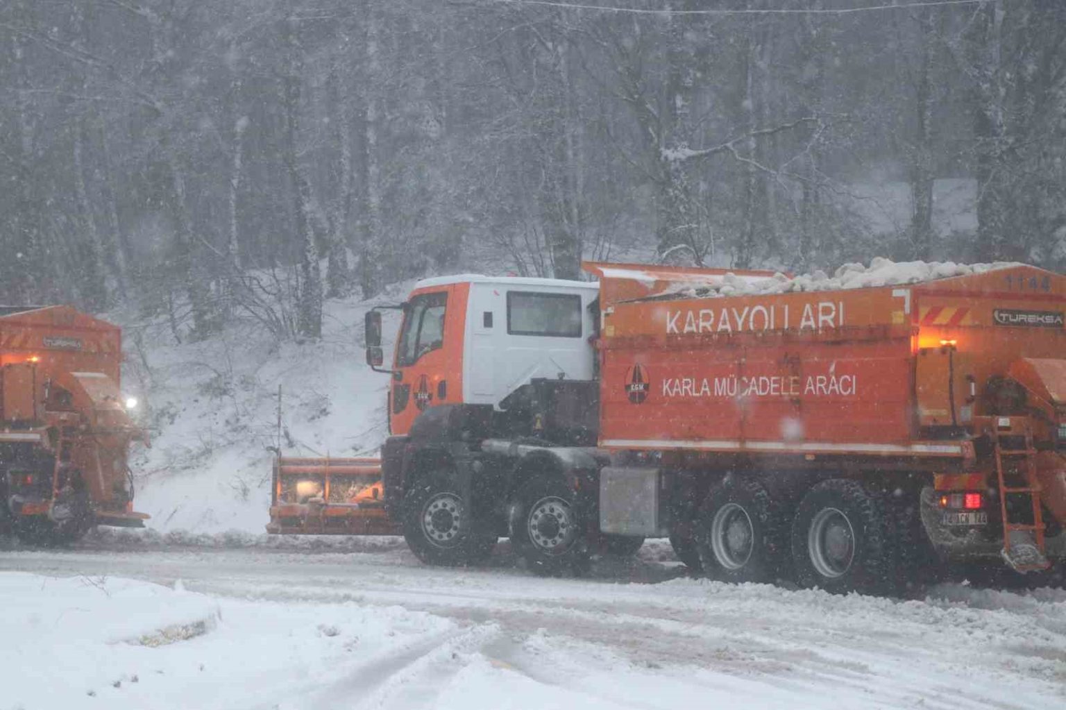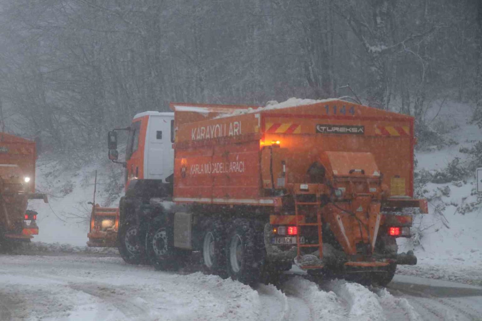 Türkiye’nin en önemli geçiş güzergahlarından D-100 karayolu Bolu Dağı kesiminde kar yağışı etkili oldu, kar kalınlığı 10 santimetreye ulaştı.
