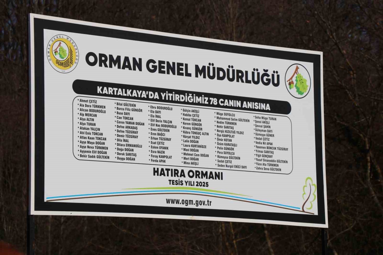 Bolu Kartalkaya Kayak Merkezi’nde bulunan Grand Kartal Otel’de çıkan yangın faciasında hayatını kaybeden 78 kişi için D-100 kara yolu kenarında oluşturulan hatıra ormanına fidan dikildi. Fidanlara, faciada yaşamını yitirenlerin isimlerinin yazılı olduğu kartlar asıldı.