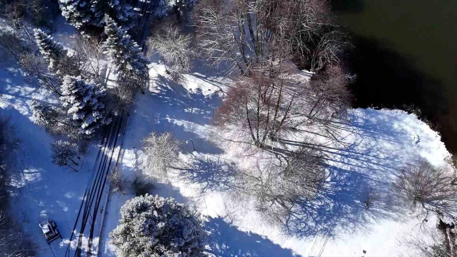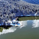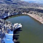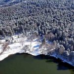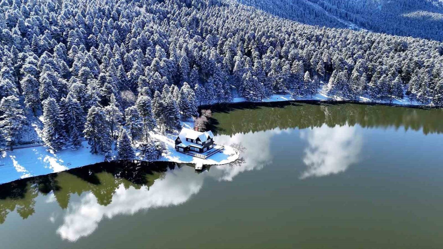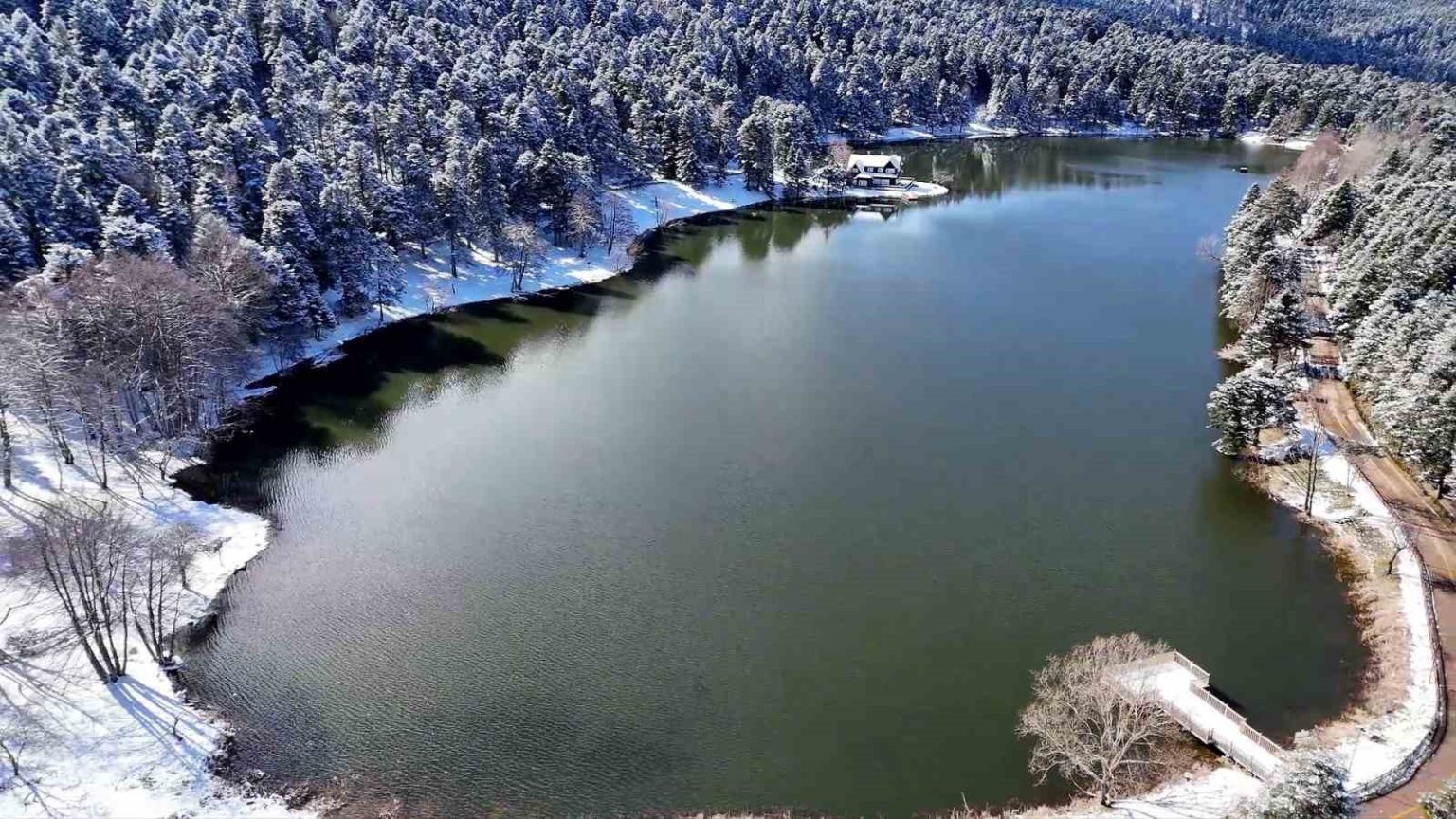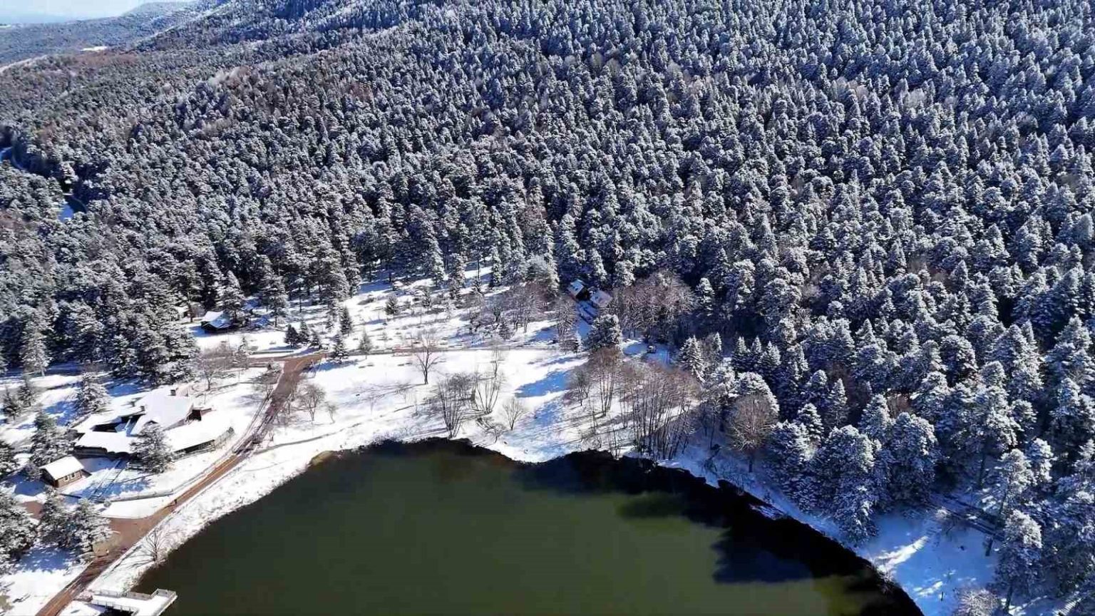 Bolu’nun doğa harikası Gölcük Tabiat Parkı, kar yağışının ardından beyaz gelinliğini giydi. Beyaz örtüyle kaplanan ormanlık alanda oluşan kış manzarası, havadan görüntülendi.