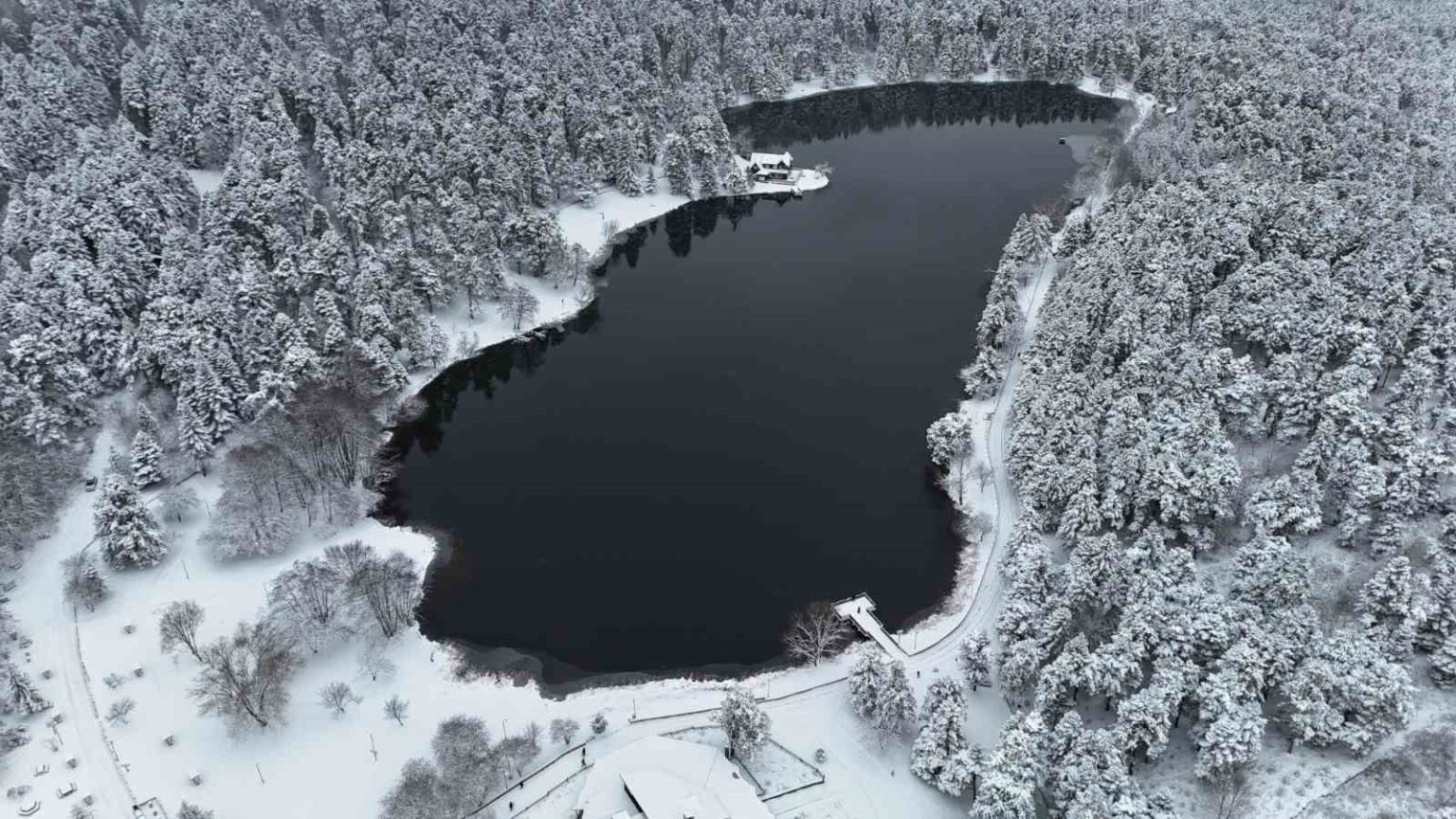 Bolu’nun doğa harikası Gölcük Tabiat Parkı, kar yağışının ardından beyaz gelinliğini giydi. Çam ormanlarının arasındaki saklı cennetin beyaz örtüyle kaplandığı kartpostallık manzara, havadan dron ile görüntülendi.
