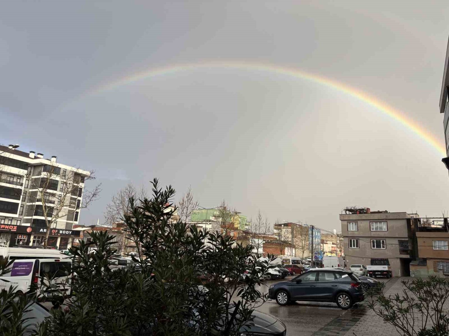 Bursa’da yağmurun ardından güneşin bulutların arasından kendini göstermesiyle ortaya çıkan gökkuşağı, izleyenleri hayran bıraktı.