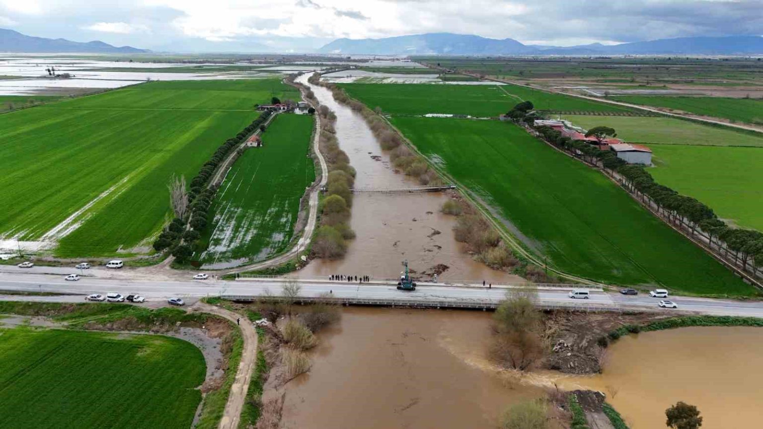 Son günlerde etkili olan sağanak yağışlarla birlikte debisi ve su seviyesi yükselen Büyük Menderes Nehri’nde yer yer taşkınlar yaşanırken, Koçarlı ve İncirliova ilçelerini birbirine bağlayan Menderes Köprüsü bölgesinde de su seviyesi kritik seviyeye ulaştı. Uzun yıllardır kuraklıkla boğuşan nehir suya kavuşurken, Menderes Köprüsü’ndeki su seviyesi 5,5 metreye ulaştı. Zaman zaman sular yola taşmaya başlarken, bölgedeki vatandaşlar da köprüdeki son durumu görmek için bölgeye akın etti. Su seviyesini görmeye gelen bazı vatandaşlar fotoğraf ve video çekerken, bazı vatandaşlar da incelemelerde bulundu. Köprüye sevk edilen ekipler de iş makinalarıyla köprü ayaklarında biriken çöpleri temizleyerek suyun akışını sağlamaya çalıştı.