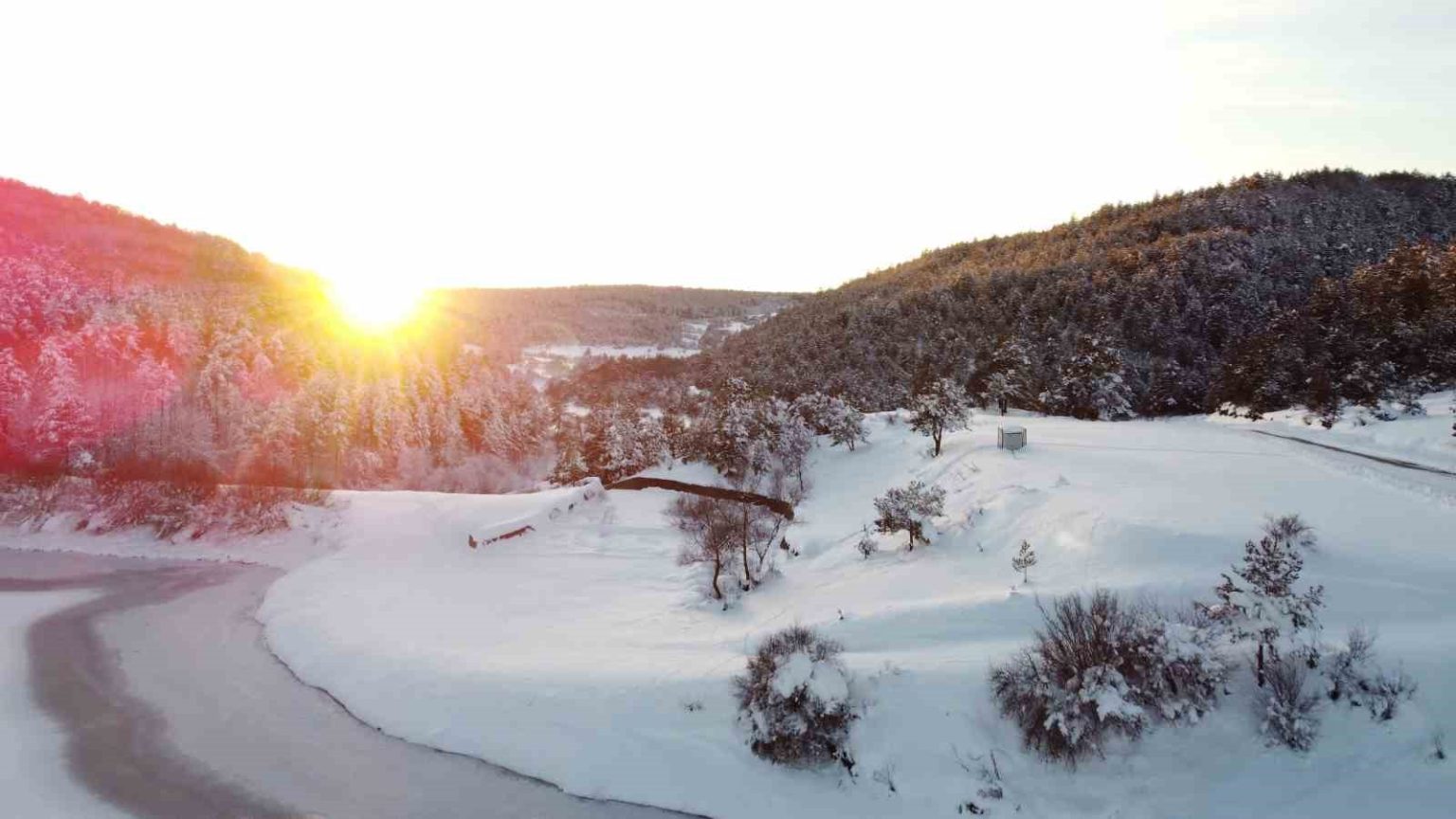 Buz tutan göletler ve çevresindeki karla kaplı alanlar, havadan kaydedilen görüntülerde kartpostallık manzaralar sunarken, bölgedeki kış güzelliği dikkat çekti.