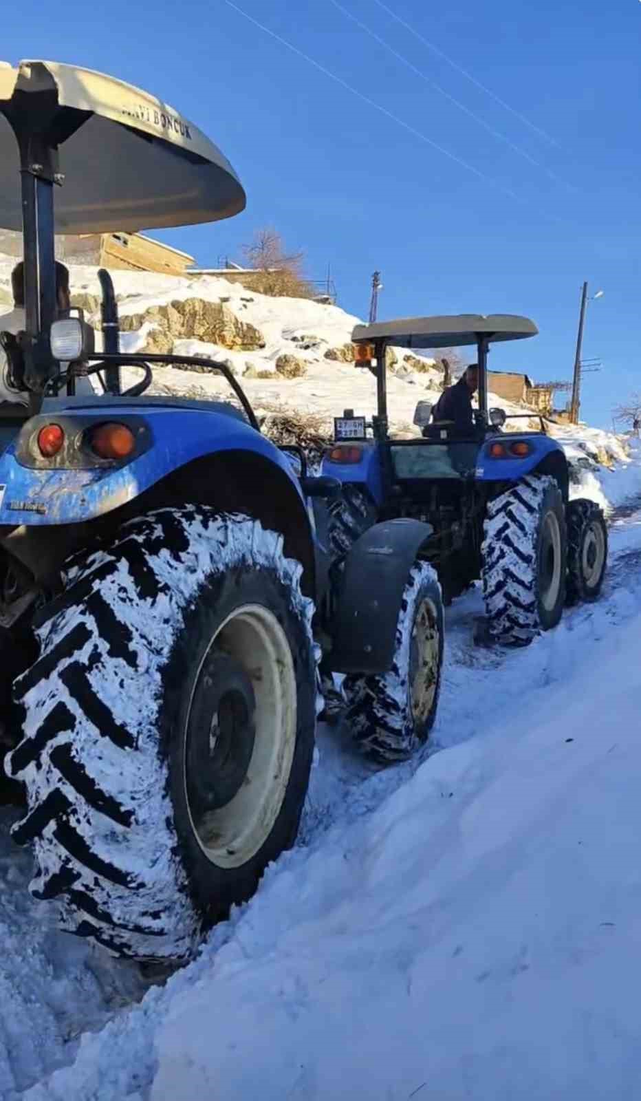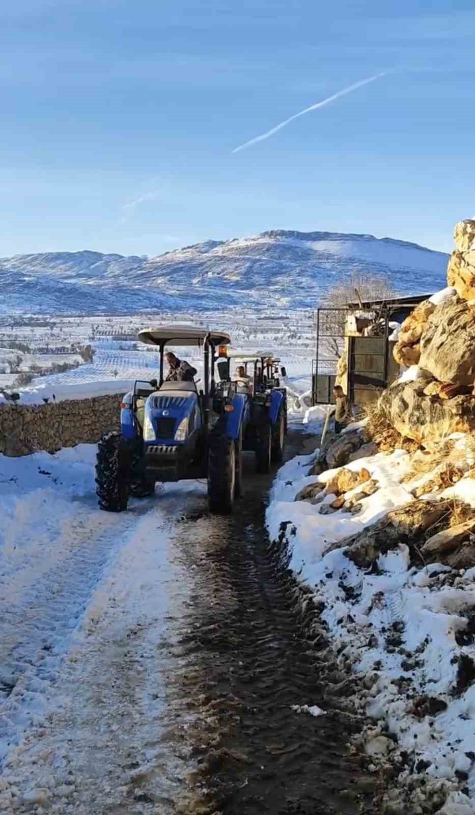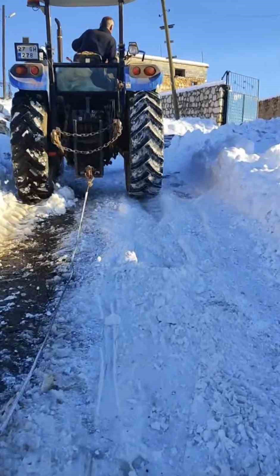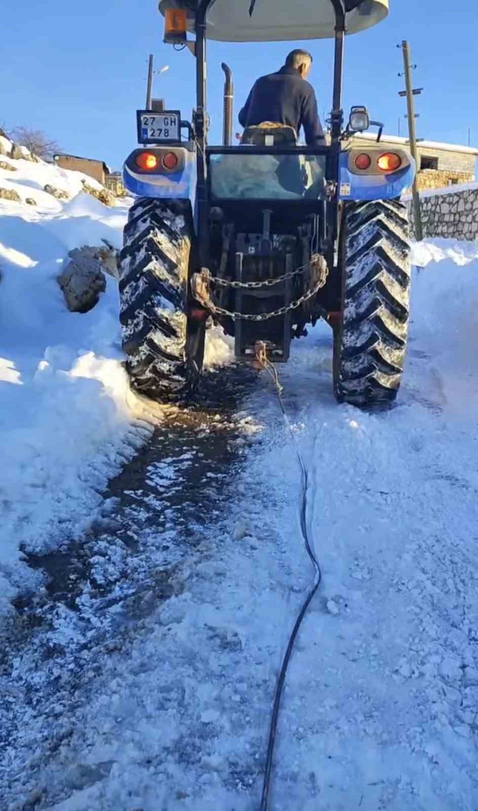 Buzlanmış yolda üç traktörü birbirine bağlayıp su taşıdılar