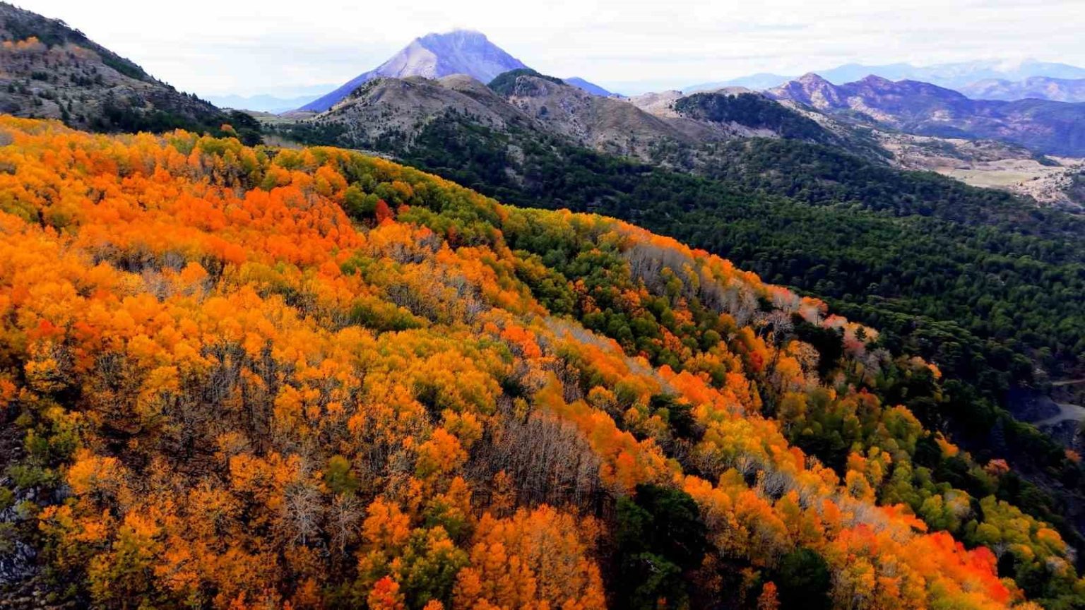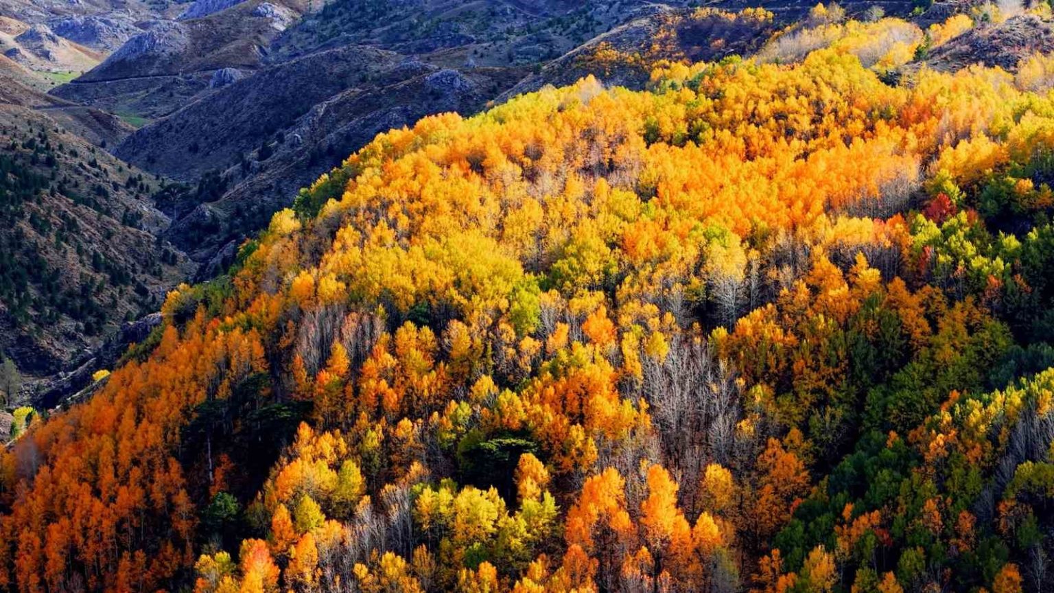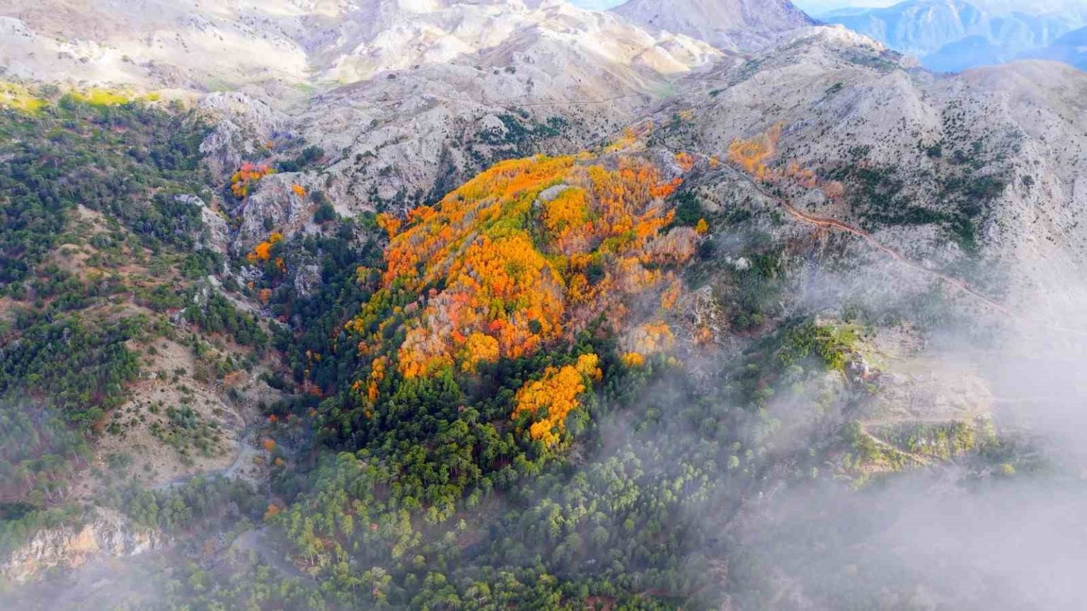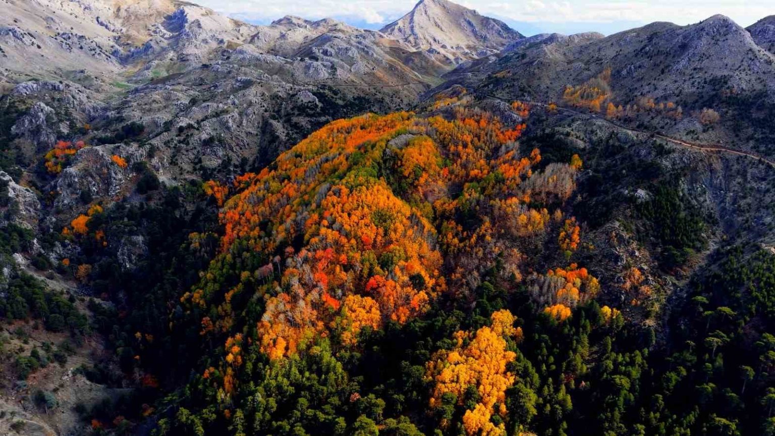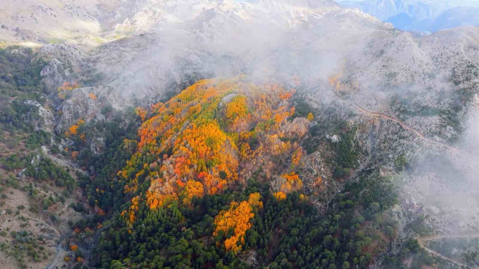Denizli’nin Çameli ilçesi, zengin florası ve yüksek endemik tür çeşitliliğiyle dikkat çekiyor. İlçenin önemli doğal alanlarından biri olan titrek kavak ormanları ise özellikle ziyaretçilerine görsel bir şölen sunuyor. Sarı, kızıl, turuncu ve yeşilin tonlarıyla oluşan renk cümbüşü havadan görüntülendi.