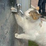 Çeşmeye patisini dayayan kedi, vatandaşların musluğu açmasıyla kana kana su içti