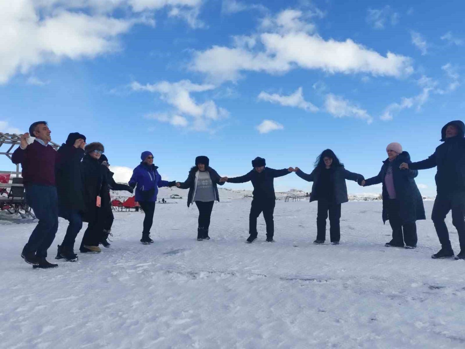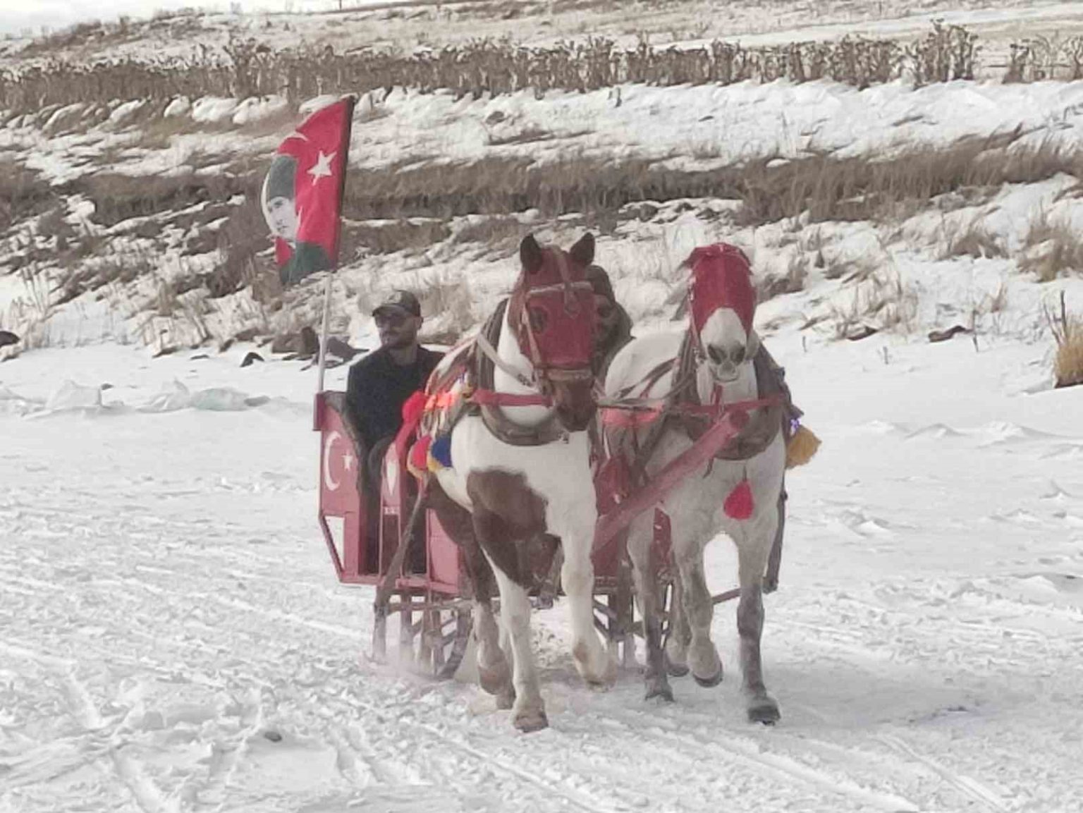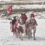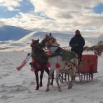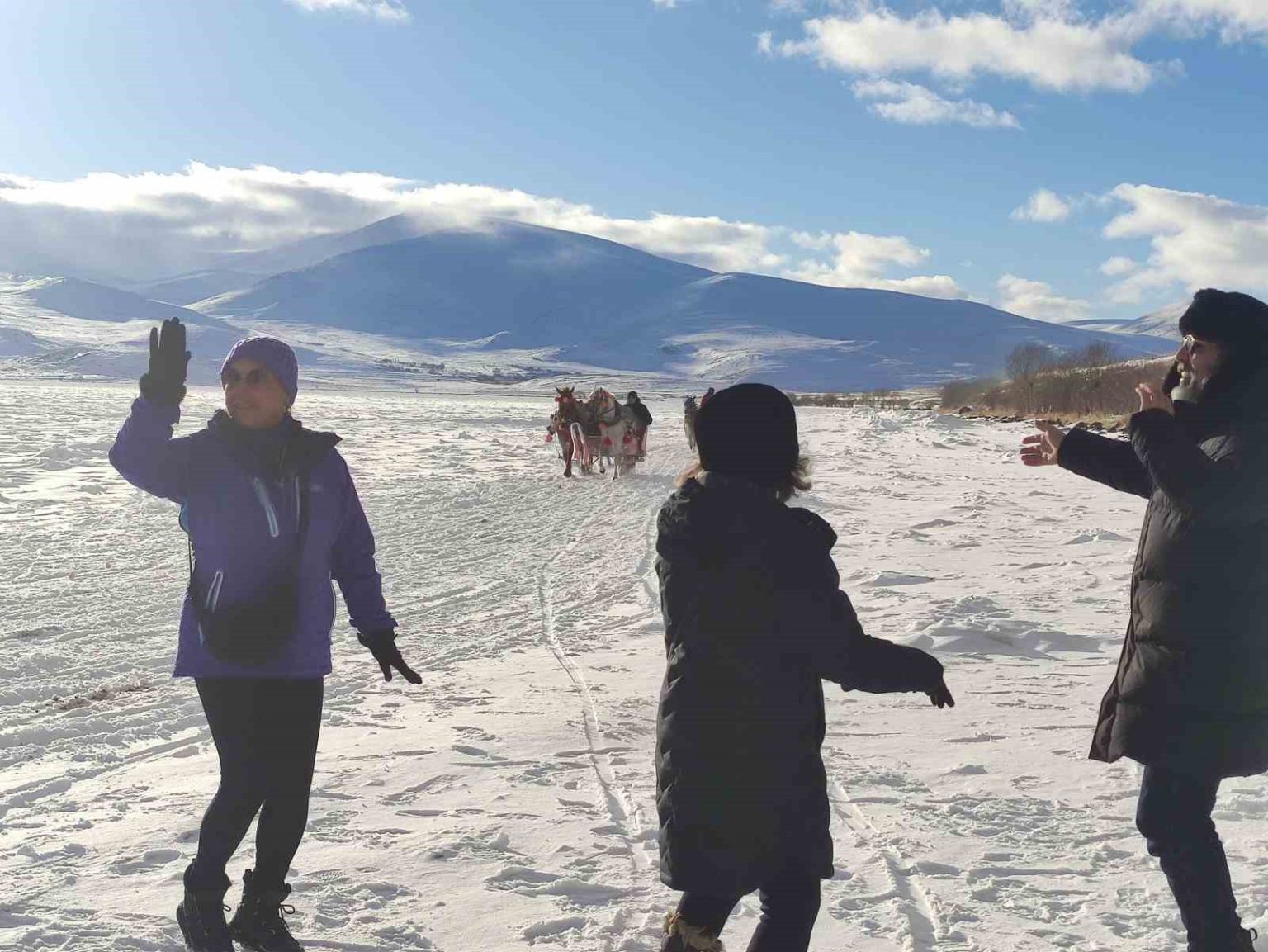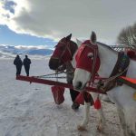 Yüzeyi tamamen donan Çıldır Gölü’ne gelen turistler, kar ve buz üzerinde halay çekti, atlı kızakla gezinti yaptı.