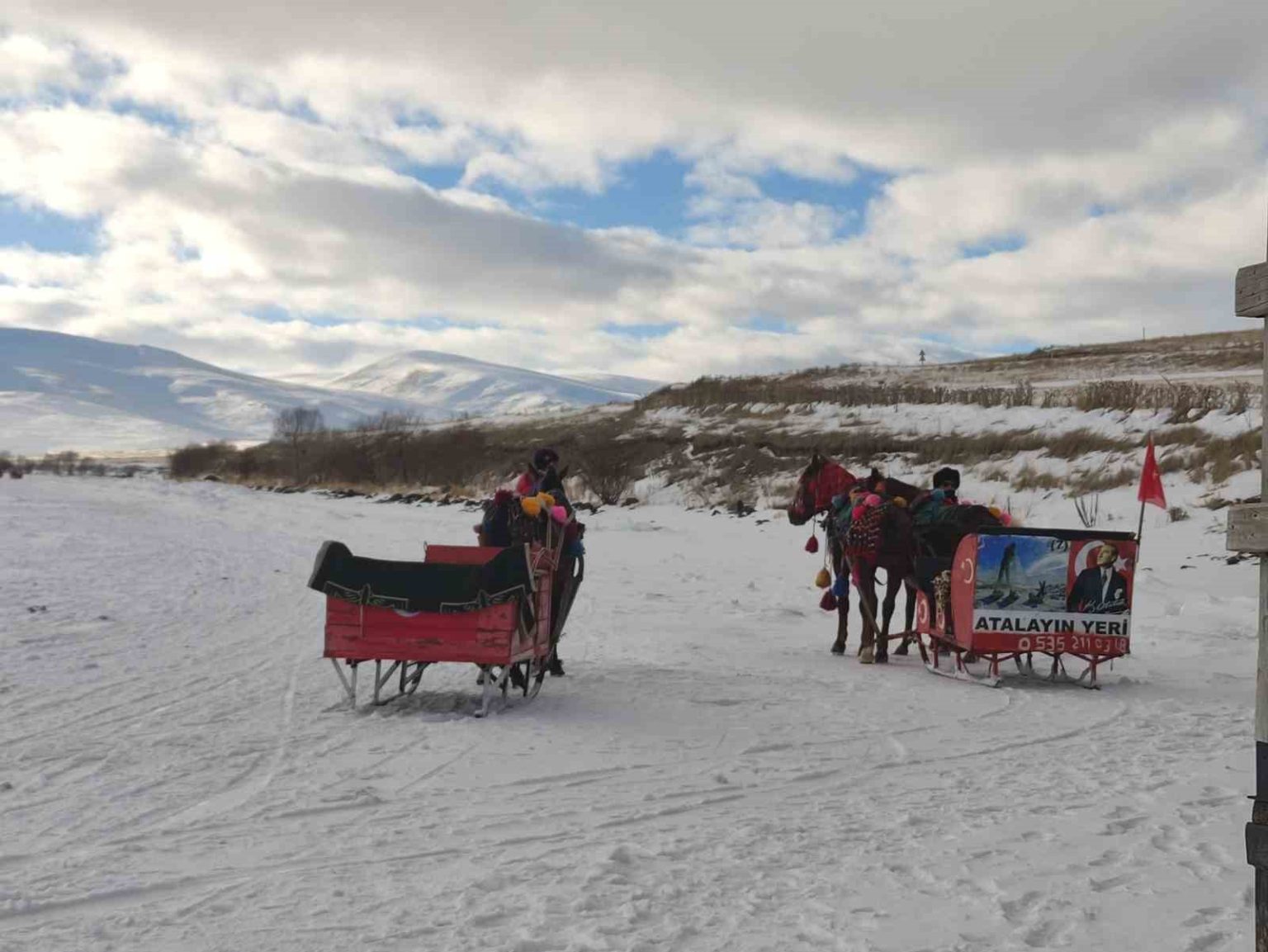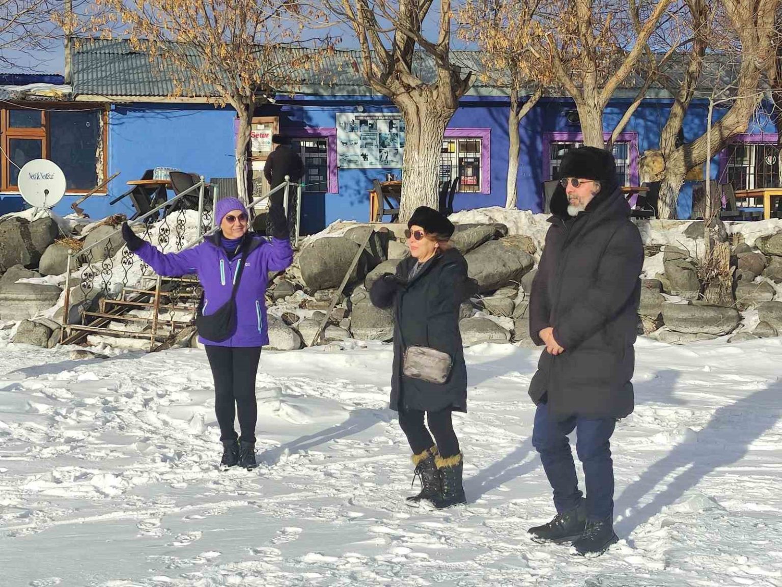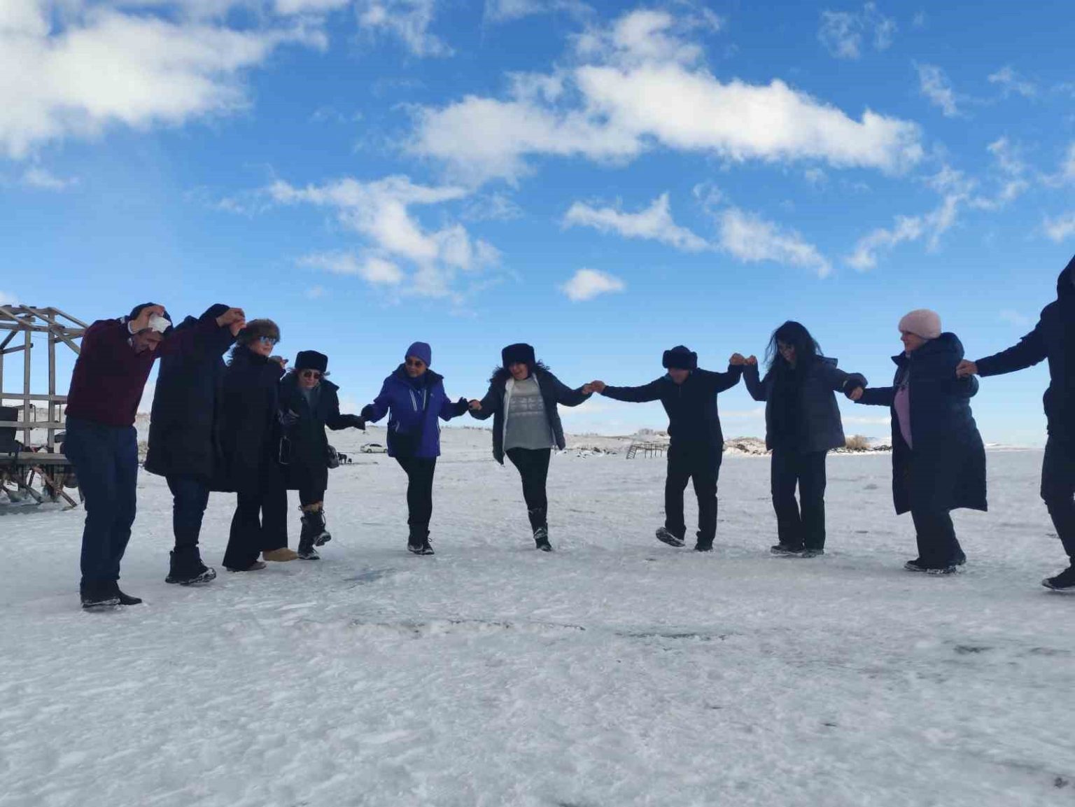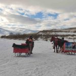 Yüzeyi tamamen donan Çıldır Gölü’ne gelen turistler, kar ve buz üzerinde halay çekti, atlı kızakla gezinti yaptı.