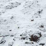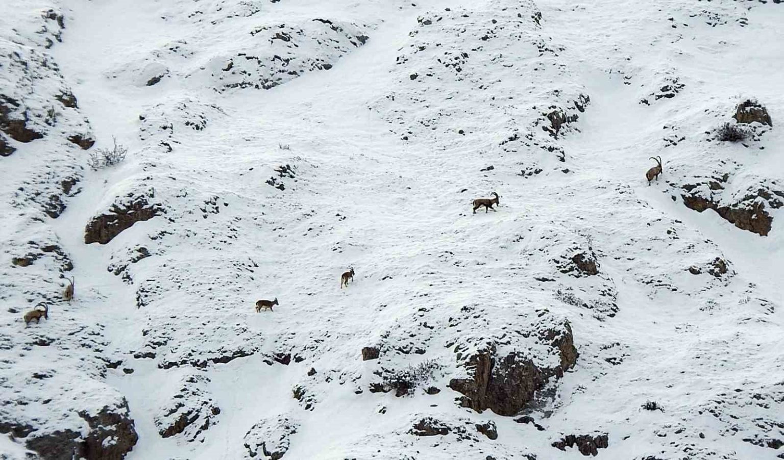 Erzincan’da Munzur Dağlarının karlı zirvelerinde dağ keçileri havadan görüntülendi.