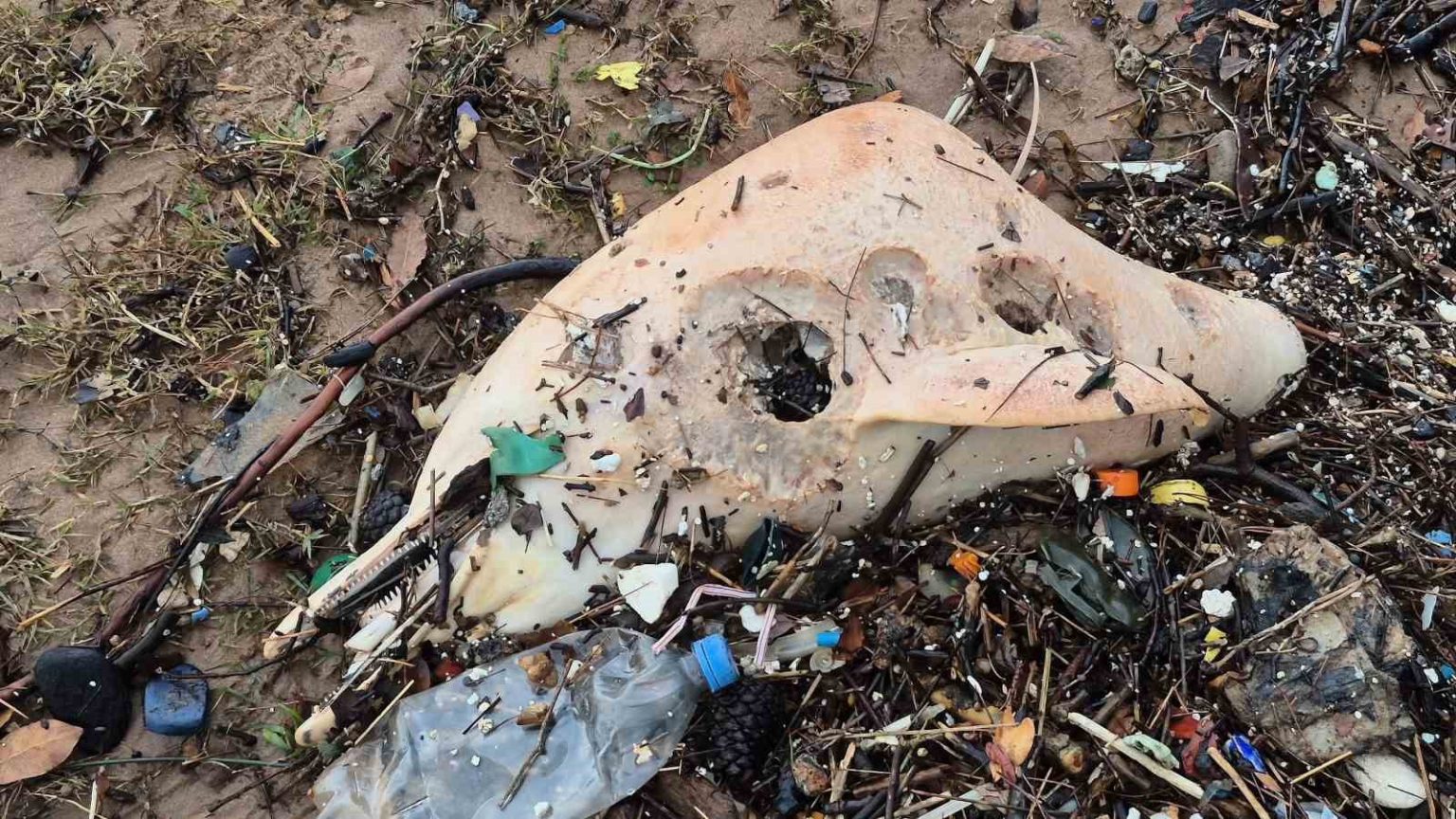 Dev dalgalar, ölü yunus balığının kalıntılarını sahile sürükledi