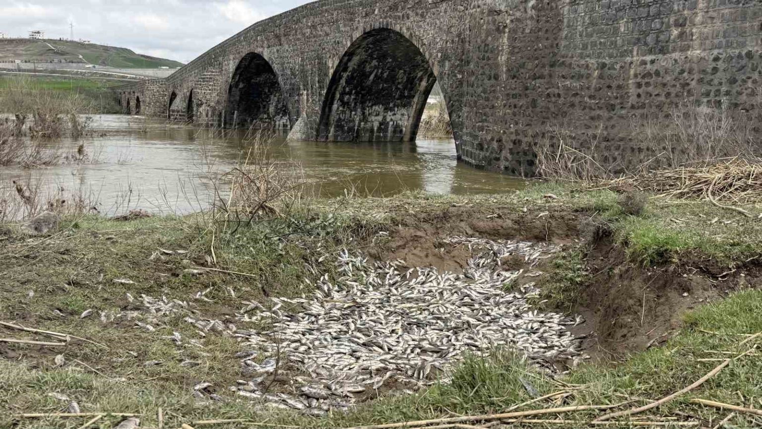 Diyarbakır’da Devegeçidi Köprüsü bölgesinde yer alan derede, çok sayıda telef olmuş balık kıyaya vurdu.