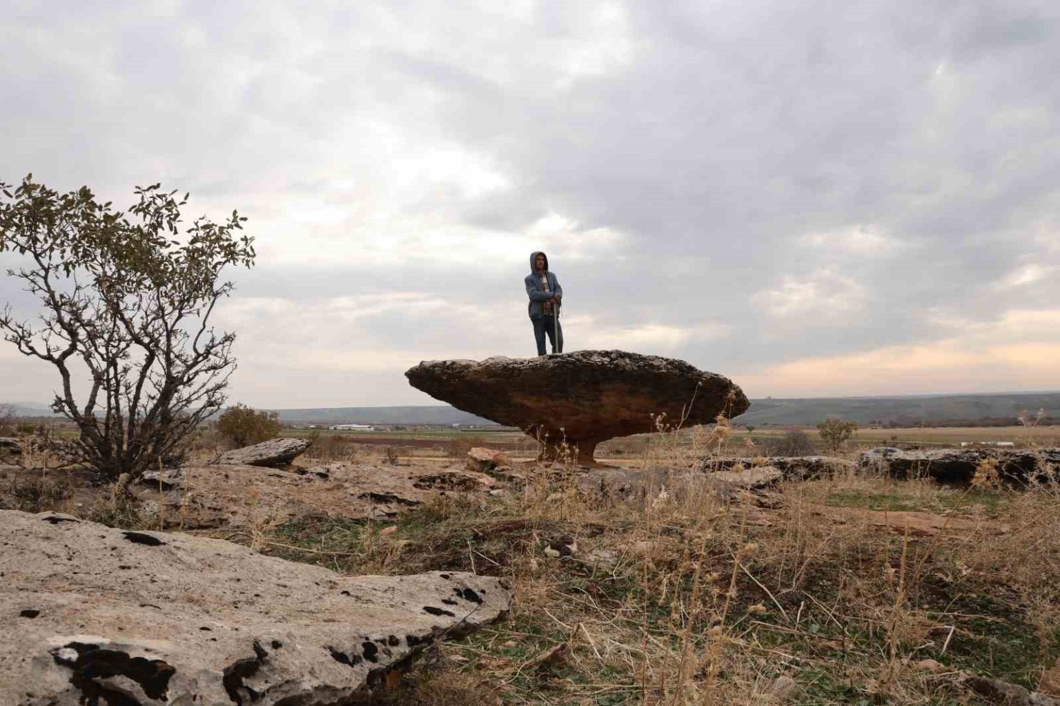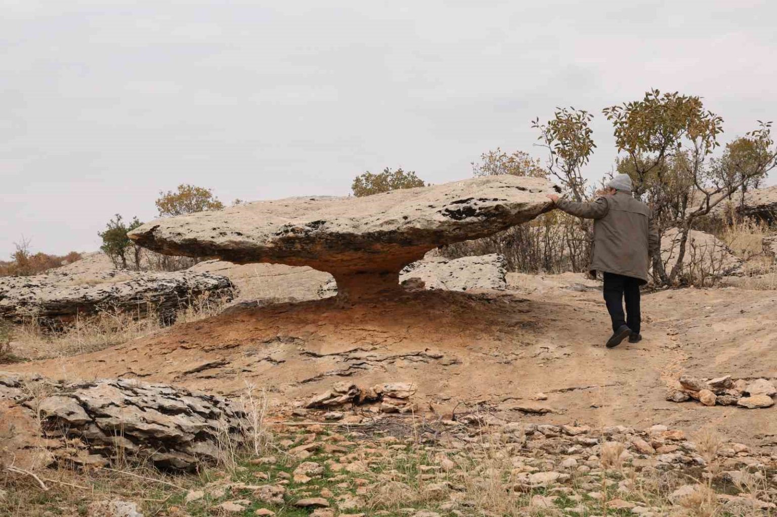 Diyarbakır’ın Kocaköy ilçesinde ince bir sütunla ayakta duran geniş kaya parçası, buzul çağı kalıntısı olarak değerlendiriliyor.