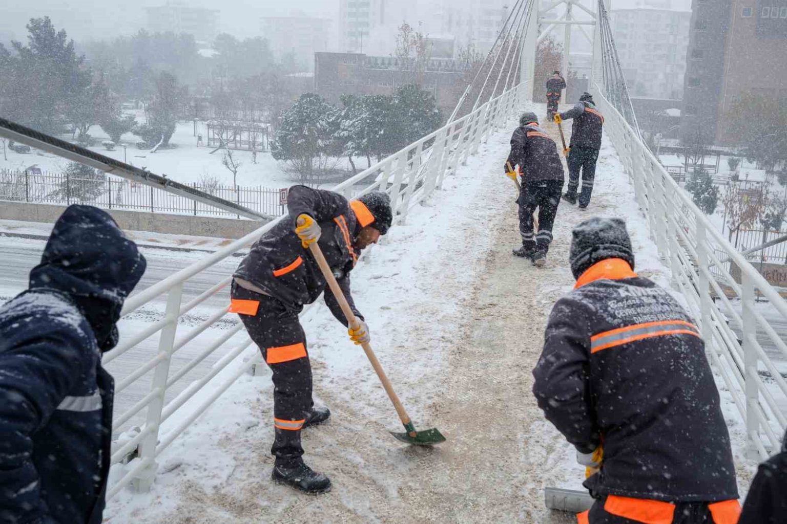 Büyükşehir Belediyesi ekipleri, vatandaşların, güvenli bir şekilde yürüyebilmeleri ve muhtemel düşmelerin önüne geçilmesi amacıyla hastane yolları, üst geçitler ve toplu taşıma duraklarında kar temizliği yaparak buzlanmaya karşı tuzlama çalışmaları yürüttü. Ana arterler ve ara sokaklarda da araç ve yaya güvenliğini sağlamak için sürekli sahada görev yapan ekipler, yaşanabilecek olumsuzlukların önüne geçmek amacıyla yoğun çaba sarf ediyor. Ulaşım Dairesi Başkanlığının kar yağışı, buzlanma ve don olayları nedeniyle vatandaşların güvenli ulaşımını sağlamak amacıyla aldığı karar doğrultusunda, Diyarbakır Büyükşehir Belediyesi otobüsleri ücretsiz hizmet veriyor. Ücretsiz toplu taşıma uygulaması 1 Ocak tarihinde de devam edecek.