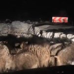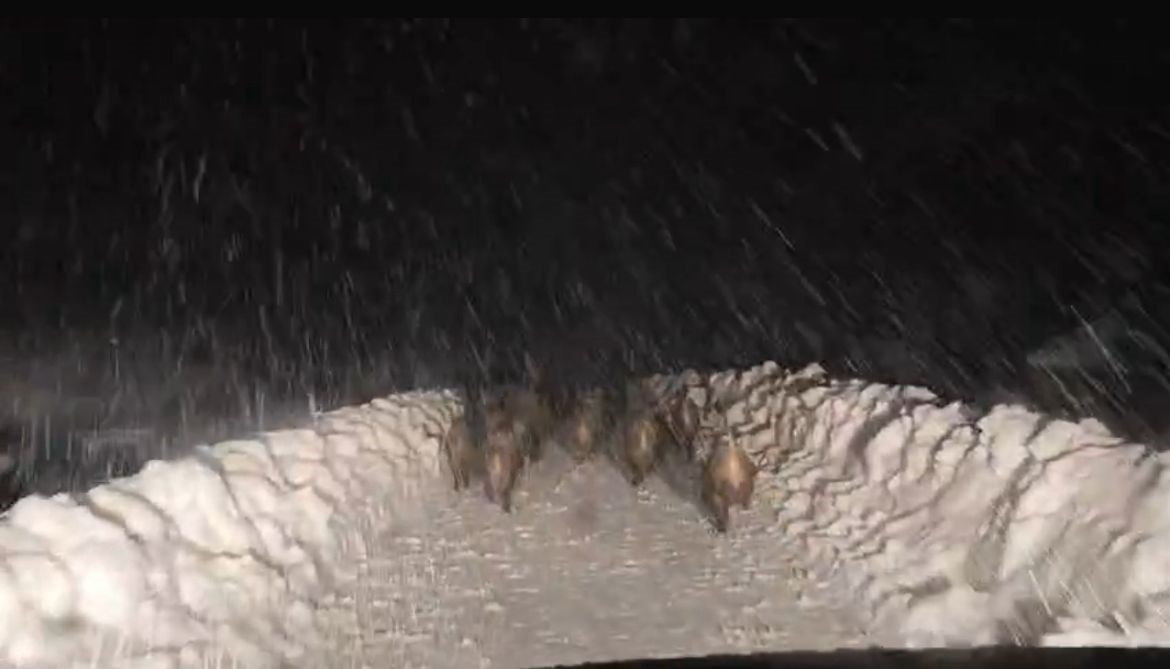 İl Özel İdaresi ekiplerinin Çeltikyolu köyünde karla mücadele çalışmaları sırasında yolda ilerleyen yaban domuzu sürüsü görüldü. O anlar cep telefonu kamerasıyla kaydedildi. Görüntüde, sürücünün karlı yolda koşarak ilerleyen domuzlara “yol verin” diye seslenmesi de yer aldı.
