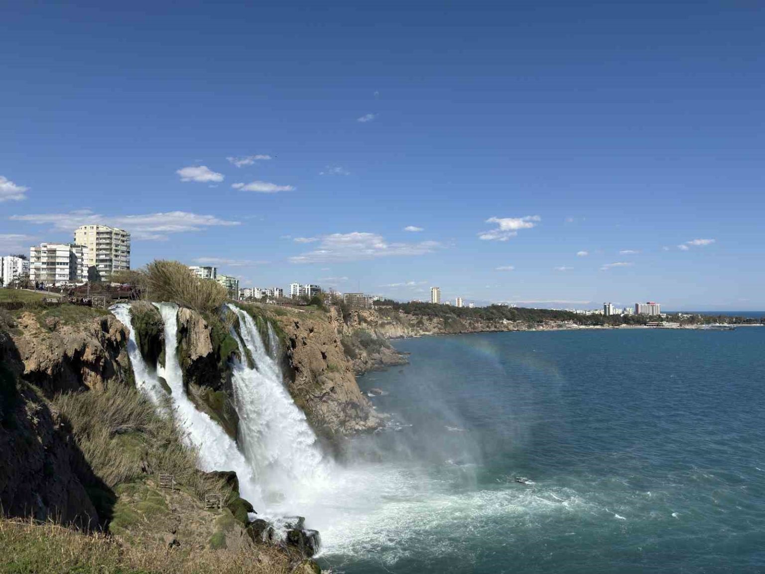 Lara bölgesinde bulunan Düden Şelalesi, her yıl olduğu gibi bu sene de yerli ve yabancı turistlerin yoğun ilgisini görüyor. Doğal güzellikleri ve eşsiz manzarasıyla ziyaretçilerini kendine çeken şelalede gökkuşağı oluştu. Düden Şelalesi’nin denizle buluştuğu noktaya gelen turistler, bu doğa harikasını ölümsüzleştirmek için birbirleriyle yarıştı. Gökkuşağı, ziyaretçilere unutulmaz anlar yaşattı.