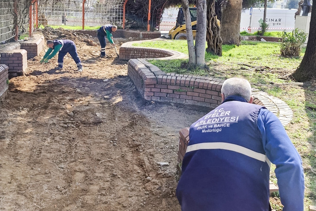 Efeler Belediye Başkanı Anıl Yetişkin’in öncülüğünde çalışmalarına devam eden Park ve Bahçeler Müdürlüğü ekipleri, kentin simge alanlarından biri olan Gül Esin Parkı’nda kapsamlı bir yenileme çalışması gerçekleştirerek parkı baştan aşağı yeniledi. Uzun yıllardır bakım bekleyen bitki örtüsünden zemin döşemesine kadar her detayın elden geçirildiği park, mahalle sakinlerinin kullanımına hazır hale getirildi. Gül Esin Parkı’nda gerçekleştirilen kapsamlı yenileme çalışmaları kapsamında, yıllardır müdahale edilmeyen dev palmiye ve çınar ağaçları titizlikle budanarak sağlıklı bir görünüme kavuşturuldu. Zemin döşemeleri tamamen yenilenen parkta, vatandaşların konforu için yerleştirilen yeni ahşap banklar ve dikilen rengarenk çiçekler, Gül Esin Parkı’nın çehresini değiştirdi.