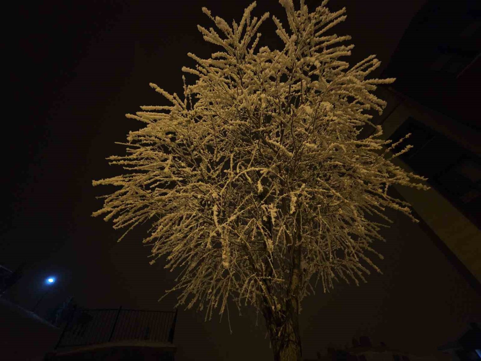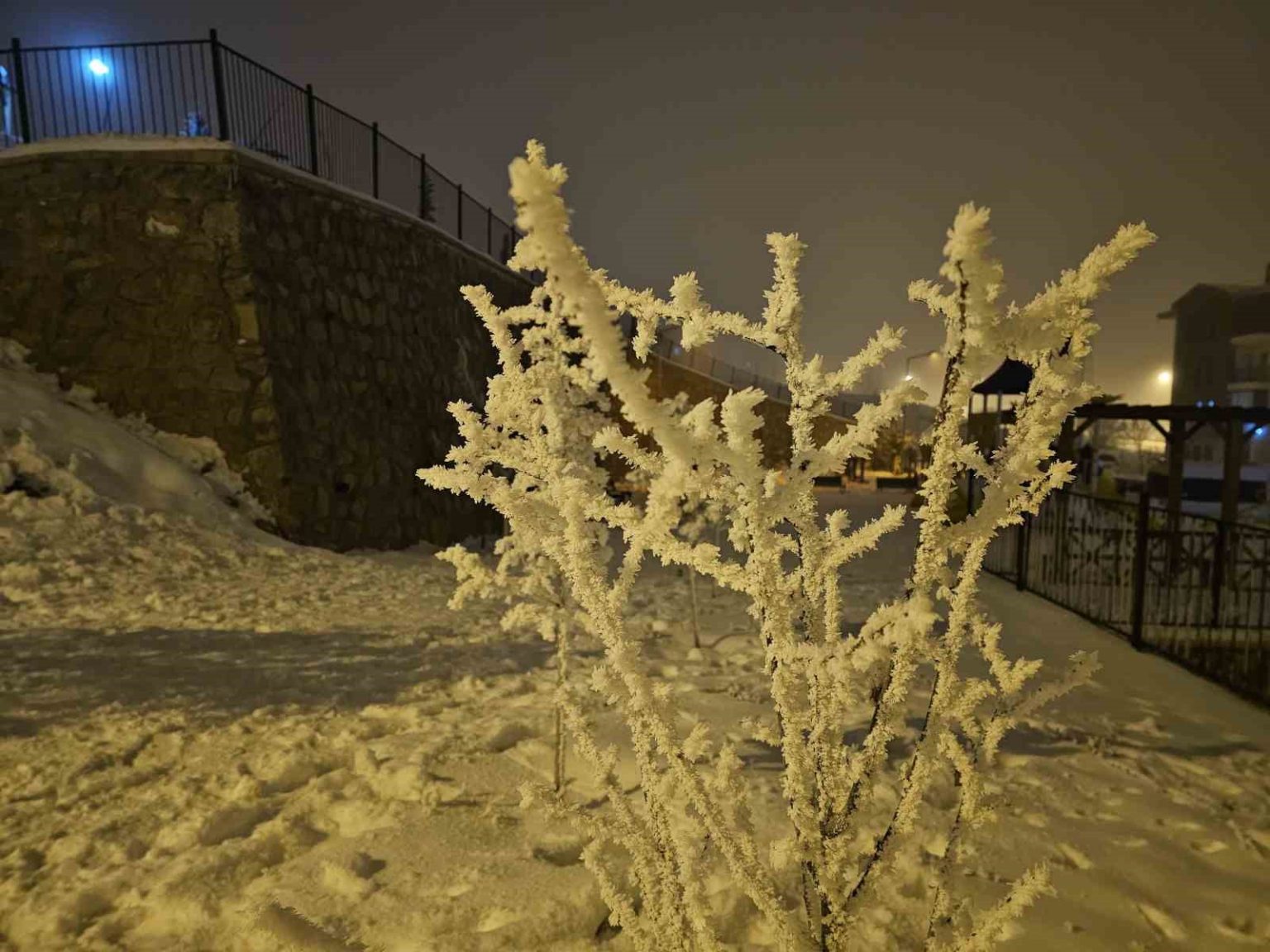 Elazığ’da etkili olan sis ve donla birlikte ağaçlar kırağı tuttu.
