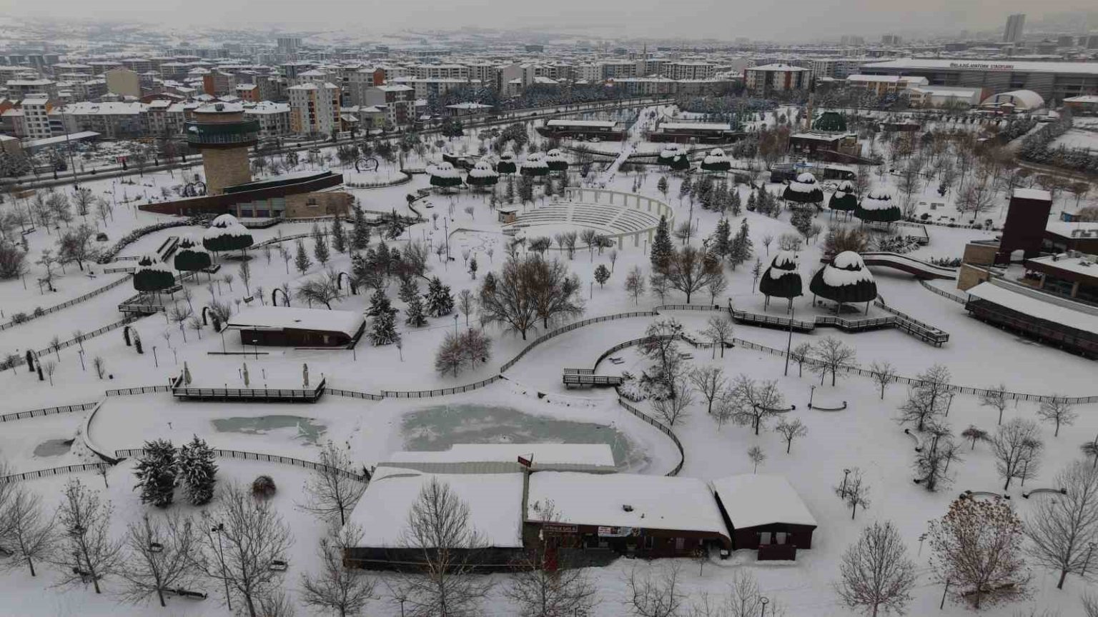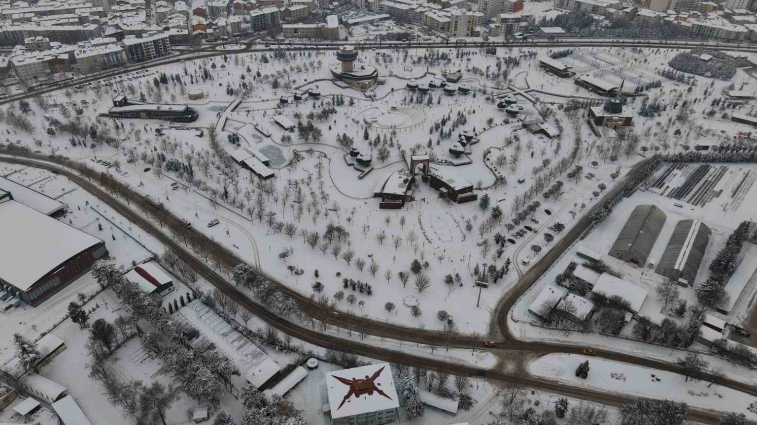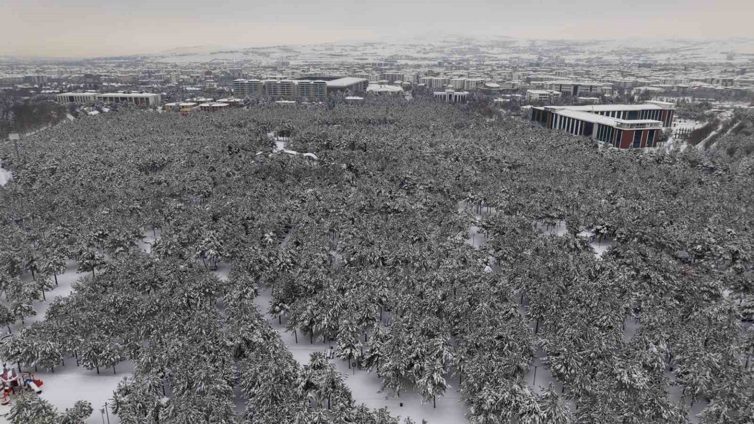 Elazığ’da kar yağışı sonrası şehrin kalbindeki Fırat Üniversitesi ormanı ve Kültür Park, binaların arasında yükselen beyaz bir vahaya dönüştü.