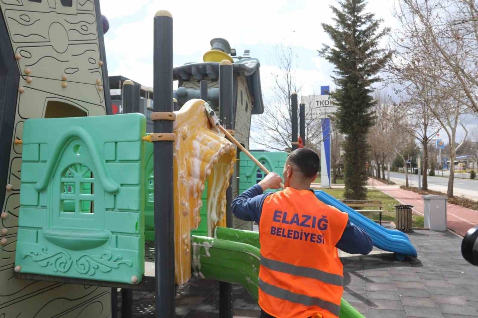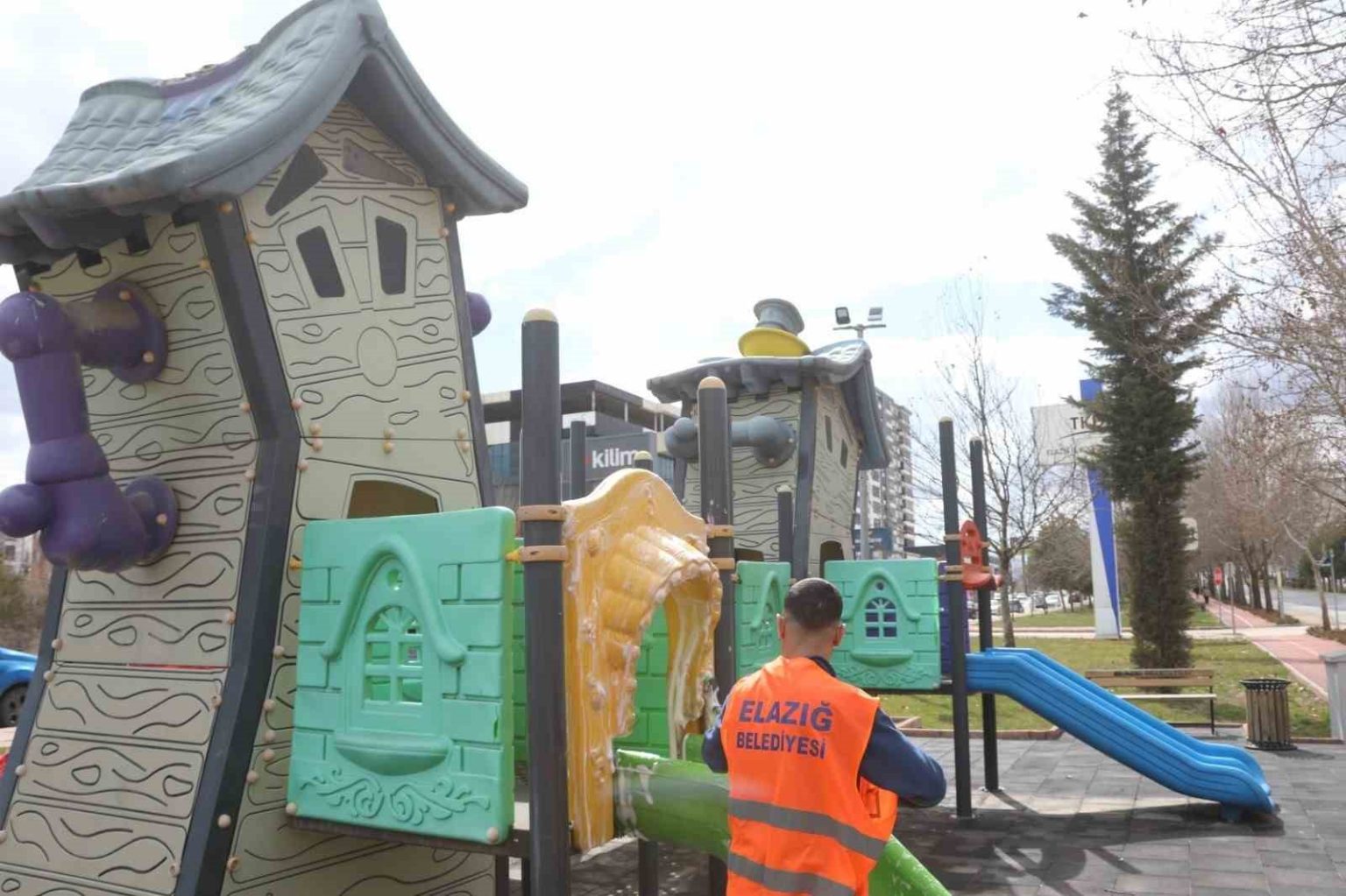 Elazığ Belediyesi, baharın gelişiyle birlikte çocuk oyun alanlarında kapsamlı temizlik ve bakım çalışmaları gerçekleştiriyor.