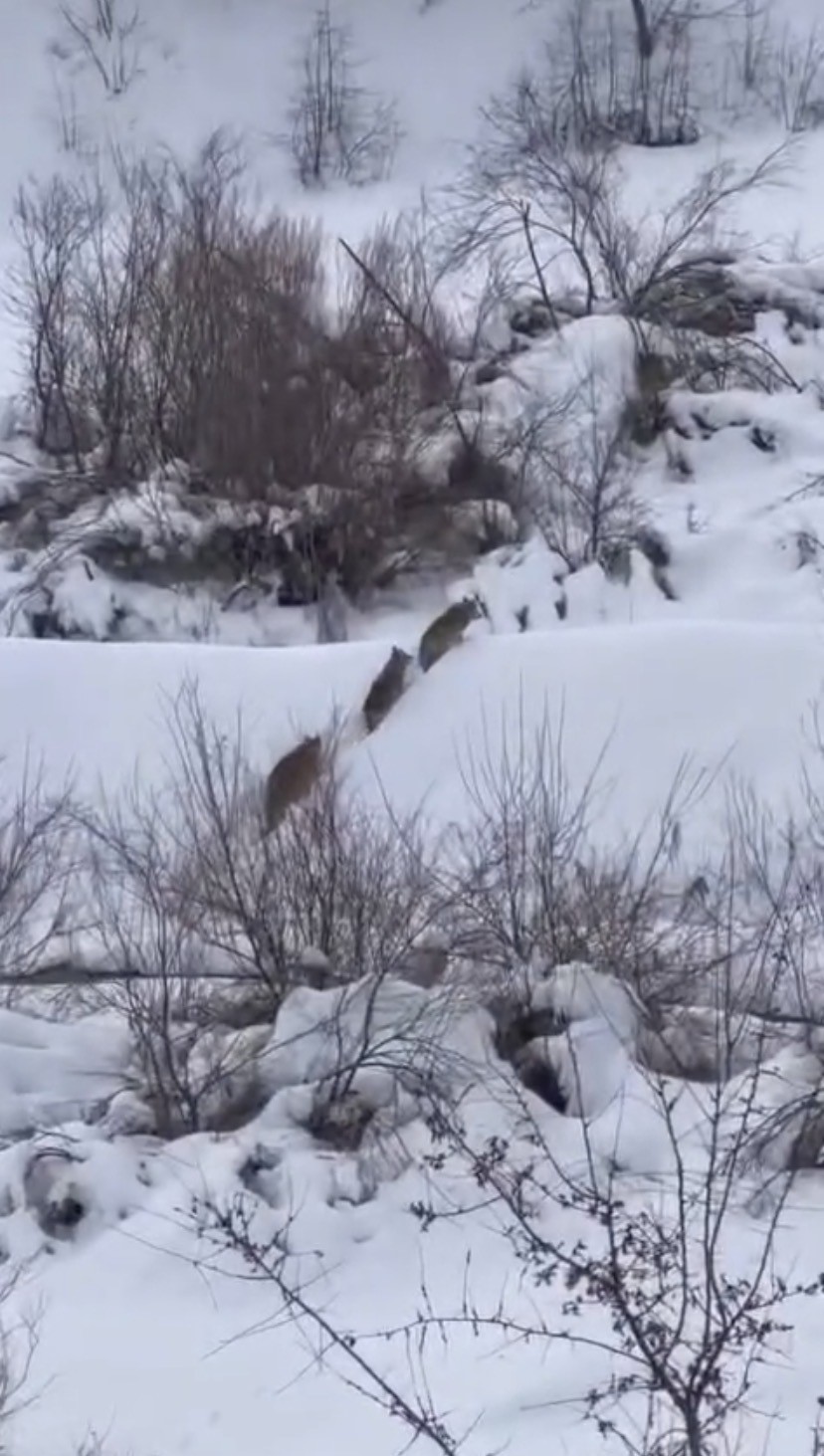 Doğada yiyecek bulmakta güçlük çeken kurtlar, Elazığ’ın Gözeli köyüne bağlı Tarlatepe mezrasında görüldü. Karların arasında yürüyen kurt sürüsü bir vatandaşın cep telefonu kamerasına yansıdı. Kurt sürüsü, bir süre sonra gözden kayboldu.
